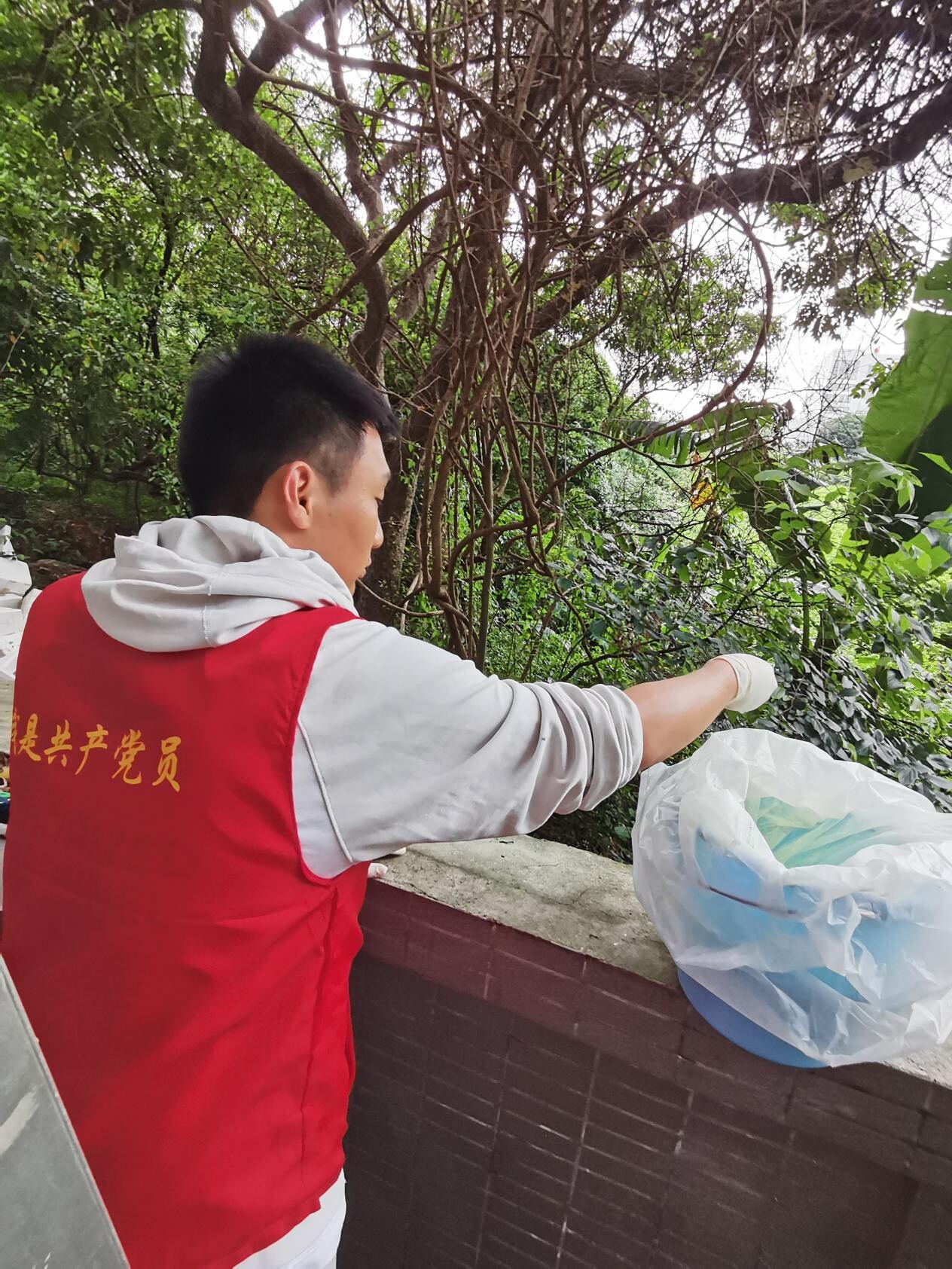 在廣州航海學院內,第三組黨員誌願者揮汗如雨,徒手清理學校綠化帶內的落葉、垃圾及雜草。
