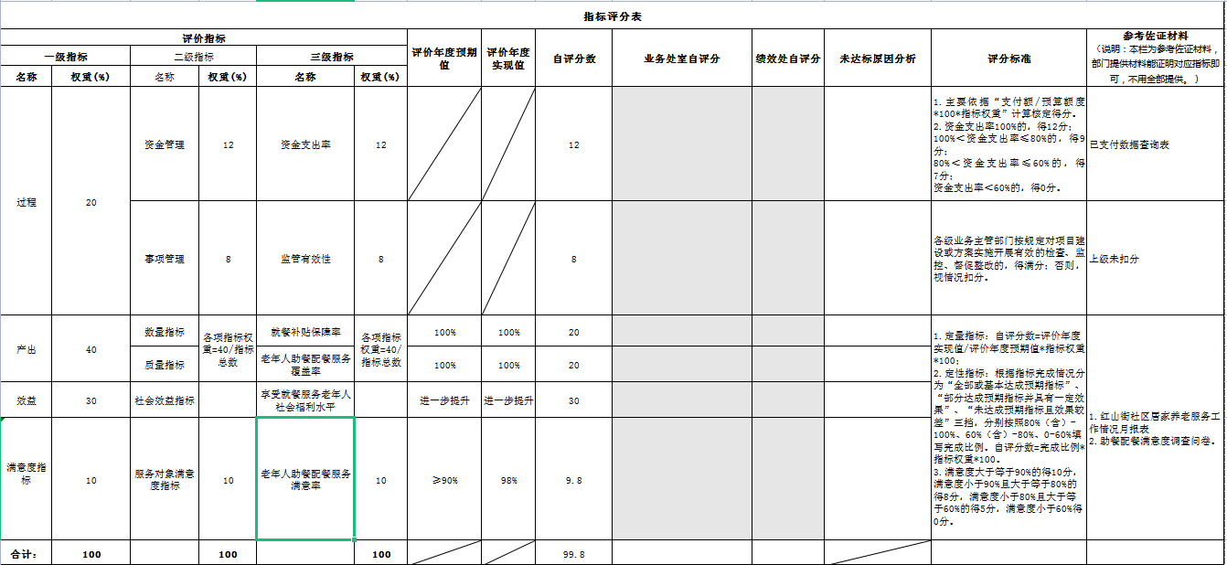 此項目資金支出率、就餐補貼保障率、老年人助餐配餐服務覆蓋率均達100%,老年人服務滿意率98%,進一步提升就餐服務老年人社會福利水平。