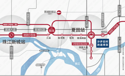 近2地鐵3站點,4站直達魚珠CBD、5站通達天河。地鐵13號線、5號線東延線交彙。夏園站、南崗站、保盈大道站(規劃中)三站點環繞。
