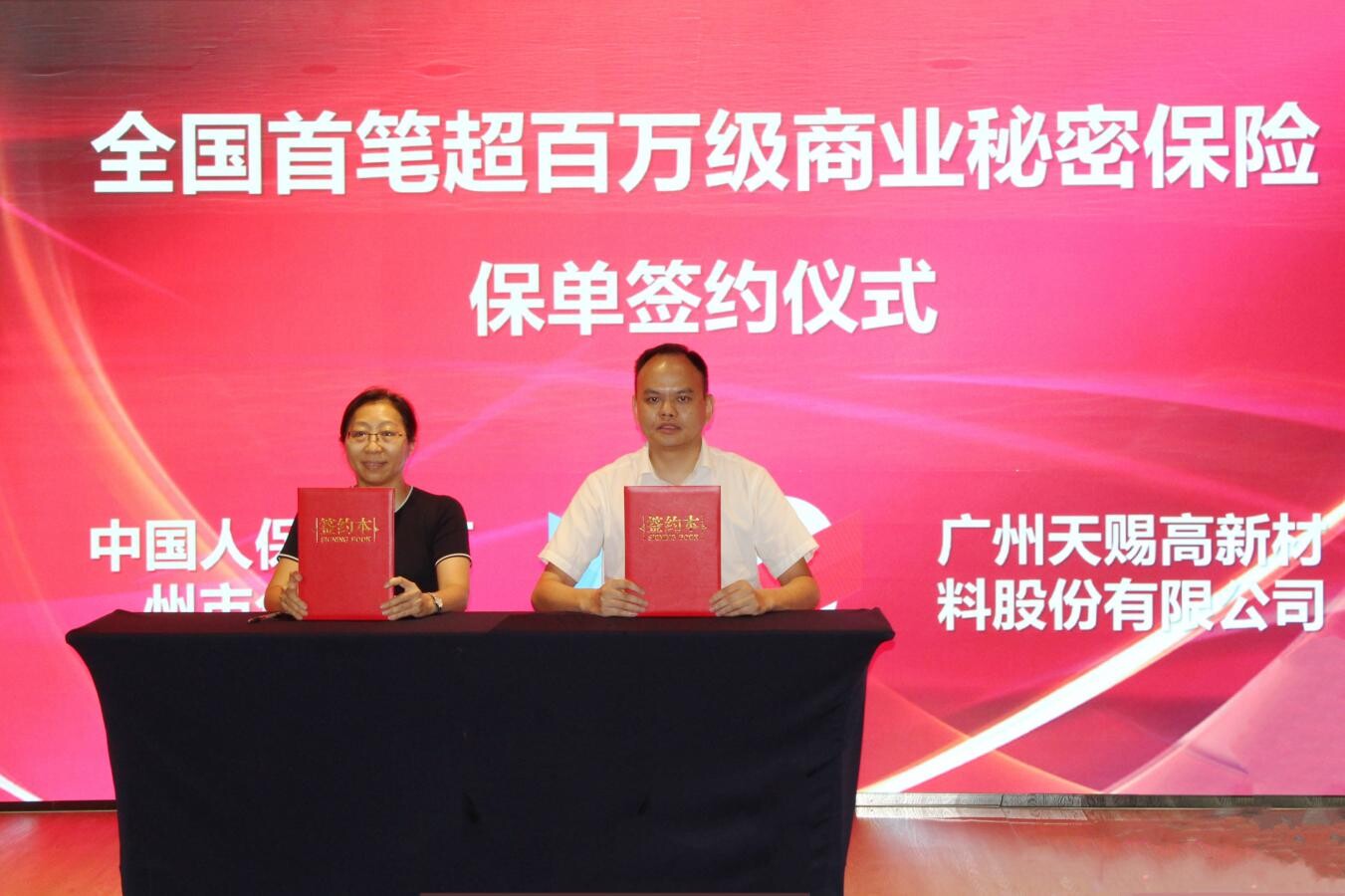 隨後,人保財險與廣州天賜高新材料股份有限公司正式簽約全國首筆超百萬級商業秘密保險保單,該保單的落地標誌著我國商業秘密保護事業邁出了重要的一步,將為企業提供更全麵的風險保障,助力企業在激烈的市場競爭中保持競爭優勢。