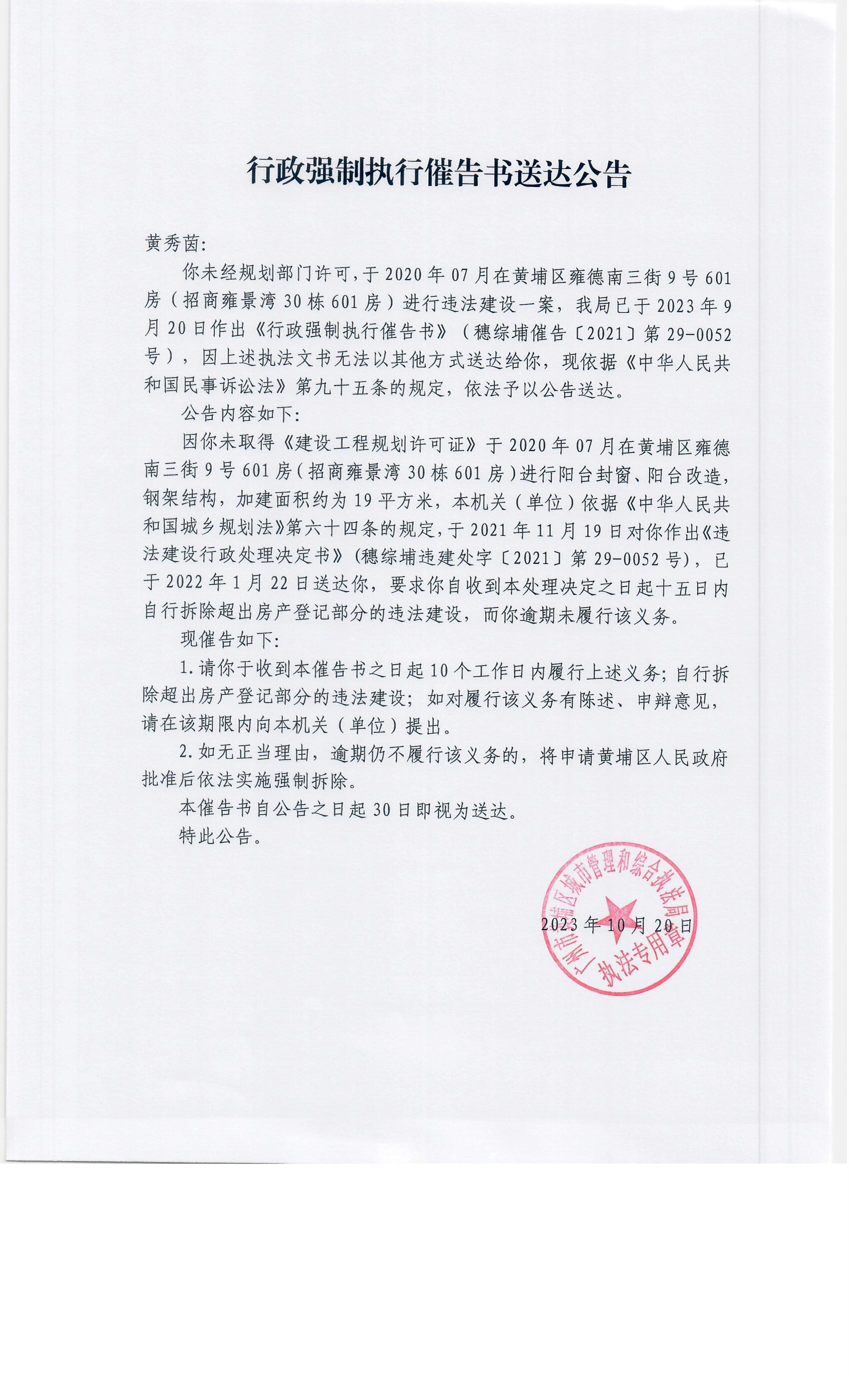 行政強製執行催告書送達公告(穗綜埔催告〔2021〕第29-0052號)