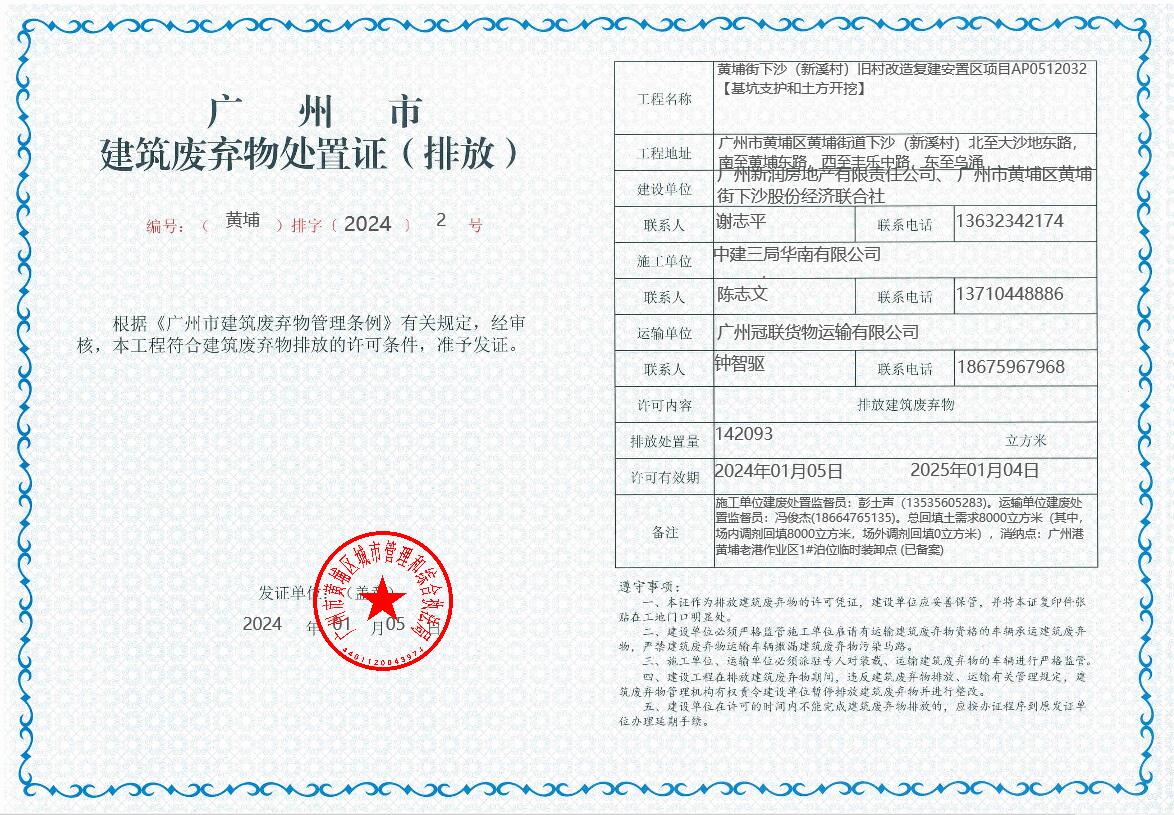 廣州市建築廢棄物處置證(排放)(黃埔排字〔2024〕2號)