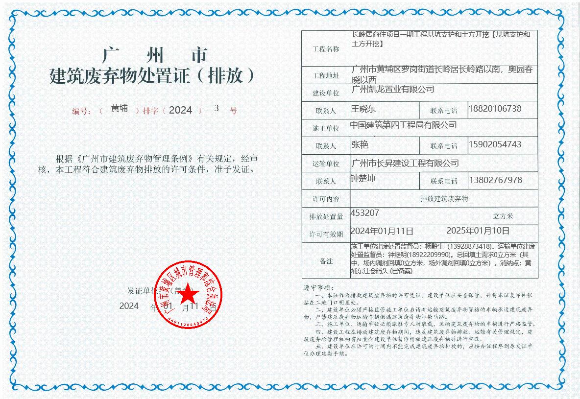 廣州市建築廢棄物處置證(排放)(黃埔排字〔2024〕3號)