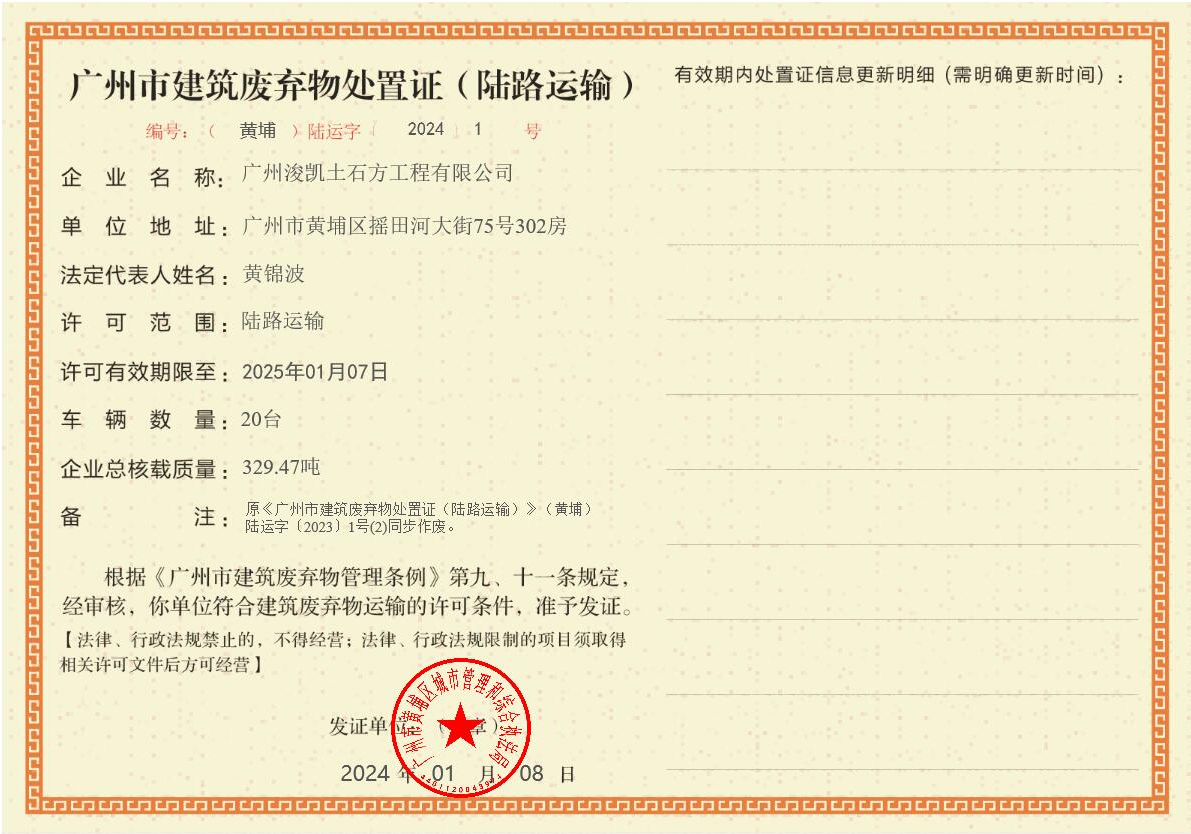 廣州市建築廢棄物處置證(陸路運輸)(黃埔陸運字〔2024〕1號)
