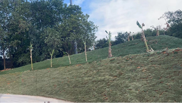 近日,穗東街廟頭社區四公頃迎來蛻變:土坡上栽種了芭蕉樹,鋪上了草皮,儼然一道綠油油的風景線。