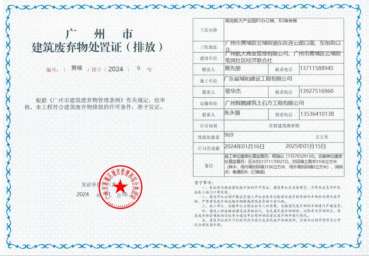 廣州市建築廢棄物處置證(排放)(黃埔排字〔2024〕6號)