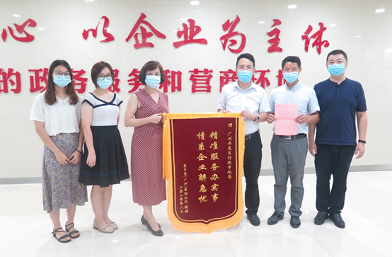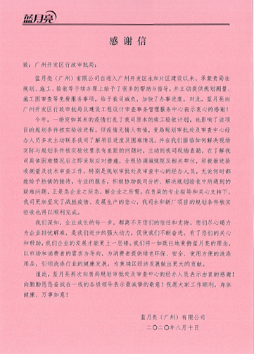 8月14日,藍月亮(廣州)有限公司負責人將一麵寫著“精準服務辦實事情係企業解急憂”的錦旗及感謝信專程送至行政審批局,對該局在藍月亮永和新廠項目辦理規劃條件核實過程中提供的優質創新、高效快捷的貼心服務表示由衷的感謝。