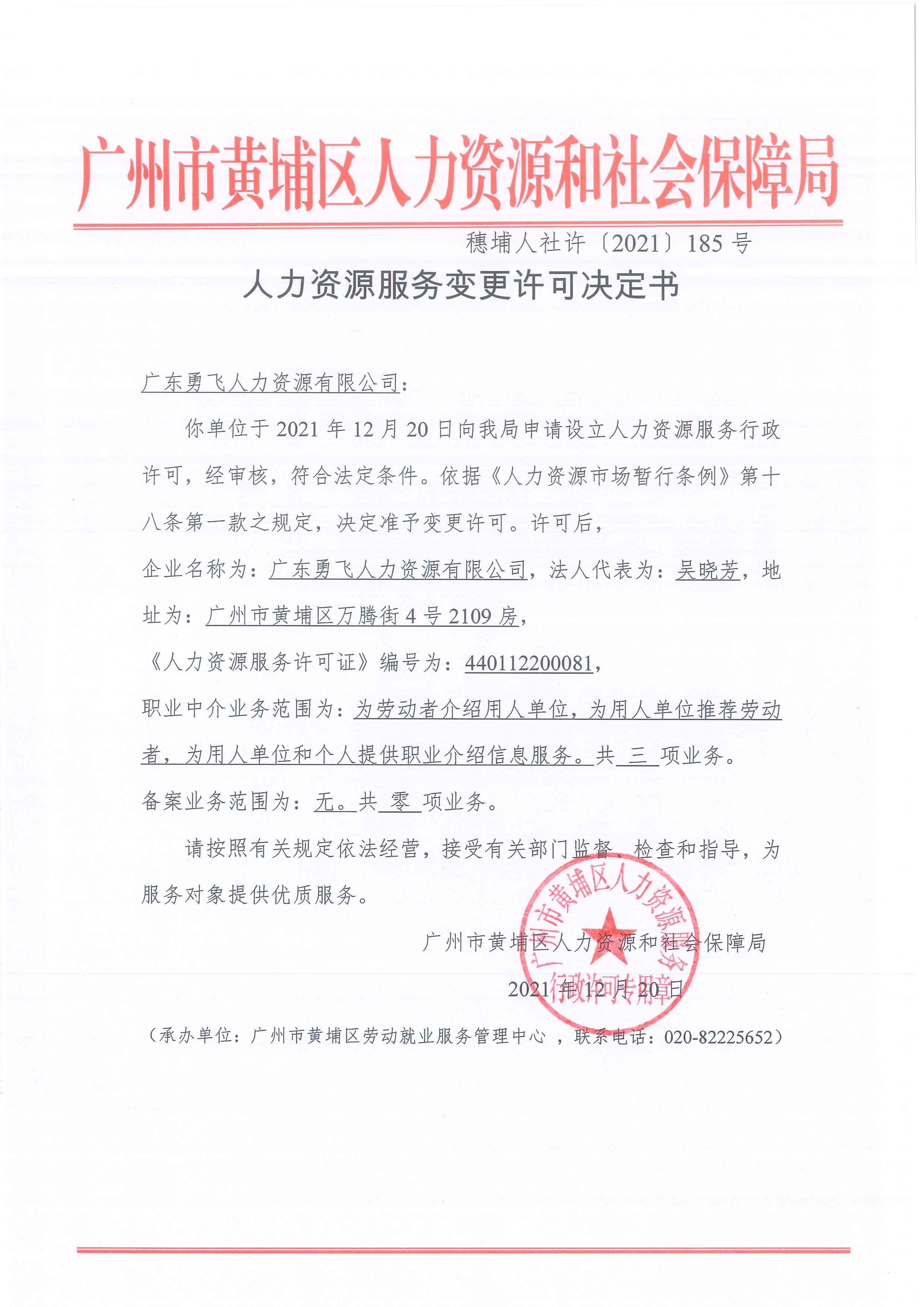 廣東勇飛人力資源有限公司人力資源服務變更許可決定書