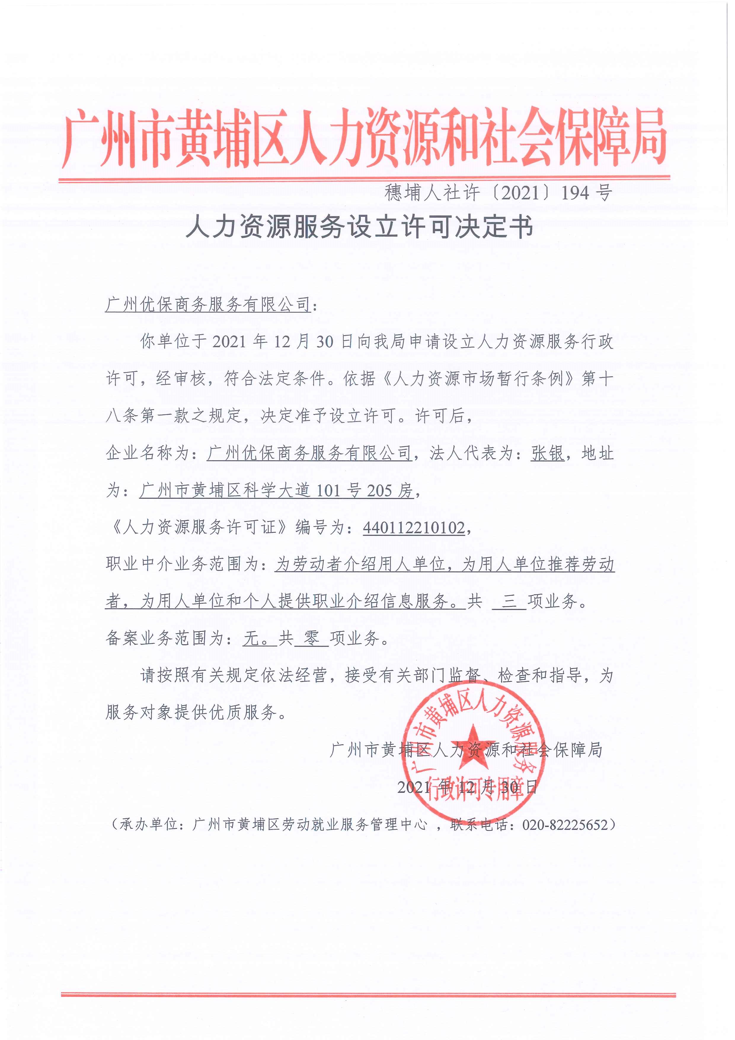 廣州優保商務服務有限公司人力資源服務設立許可決定書