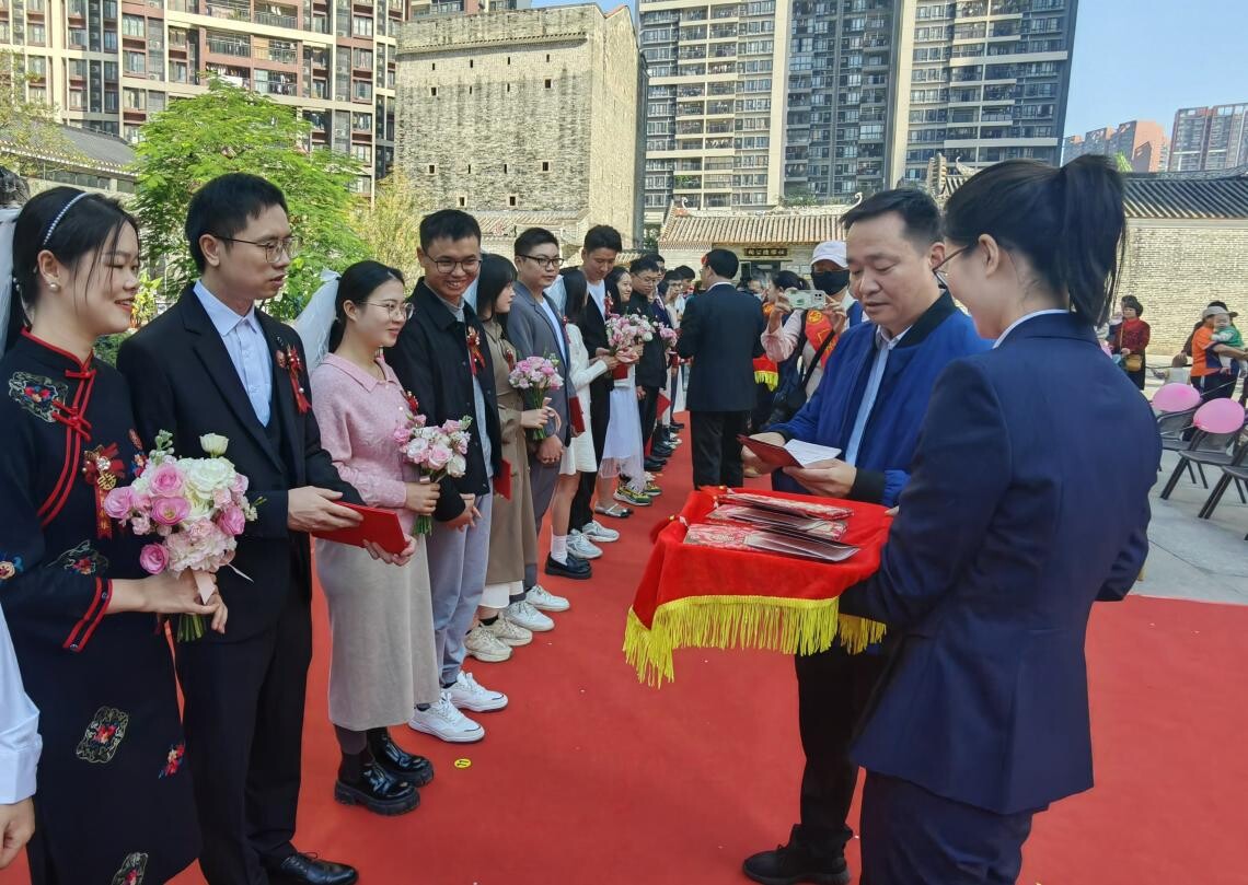 據悉,自黃埔區將舉辦結婚登記戶外頒證活動納入常態化開展機製以來,戶外頒證活動日益受到新人們的點讚追捧。此次“遇見幸福·遇見你”戶外頒證活動,共有11對新人參與。新人們攜手在“廣州·幸福裏”文化廣場集體宣誓,自願結為夫妻。黃埔區人民政府副區長黎信坤出席與特邀頒證嘉賓一同為新人們頒發結婚證書及傳統婚書。黃埔區將進一步弘揚小型婚禮大美婚俗的理念,讓婚俗改革成果惠及更多的市民,提升市民結婚登記的儀式感、獲得感和幸福感。