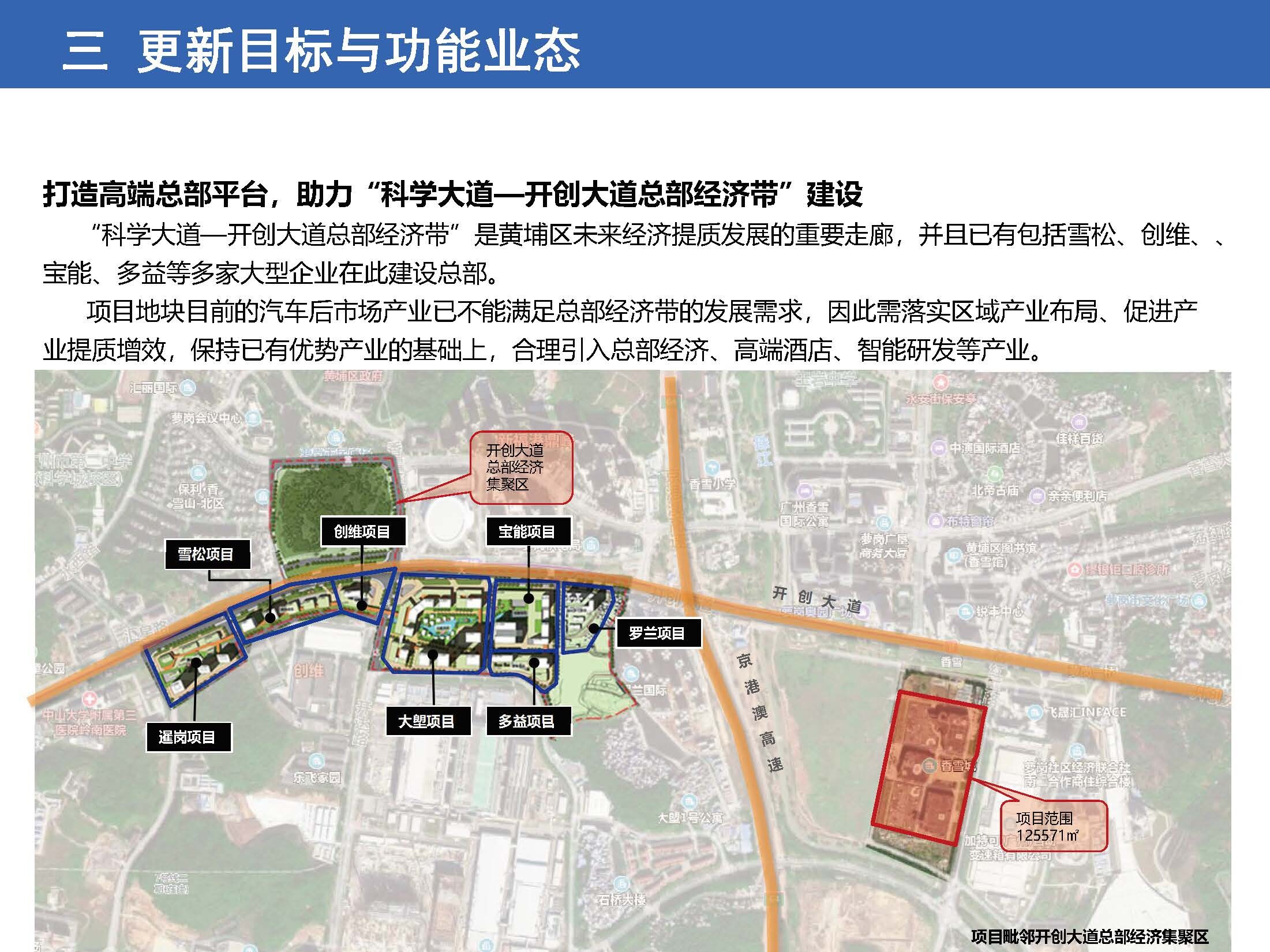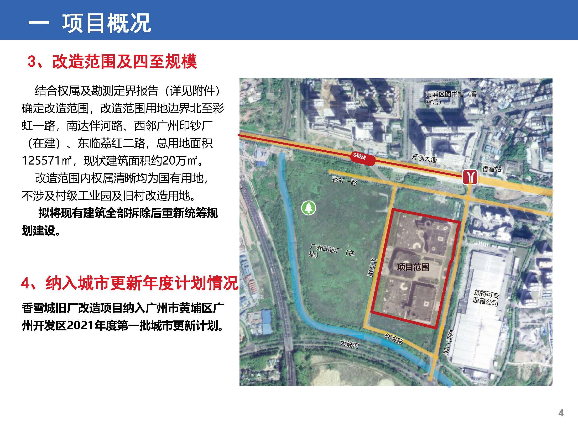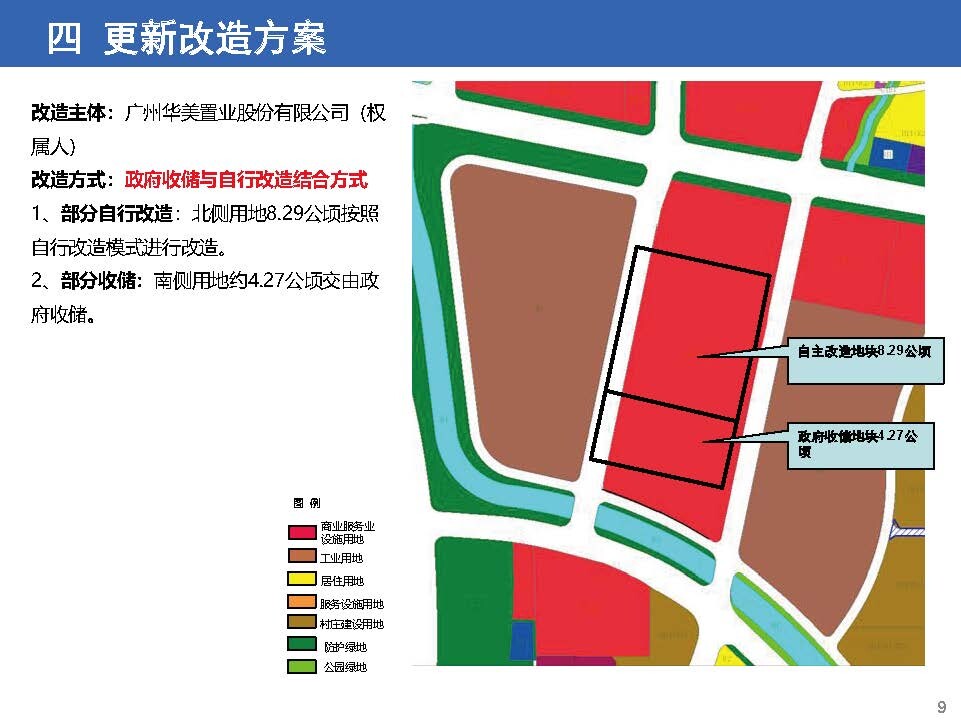 該項目已納入《廣州市黃埔區廣州開發區2021年第一批城市更新年度計劃》(穗開更新〔2021〕43號),同意該項目以“自行改造和政府收儲結合”方式實施更新改造,其中自行改造地塊用地麵積8.29公頃,改造主體為權屬人,政府收儲地塊用地麵積4.27公頃,交由區土地儲備機構進行收儲。