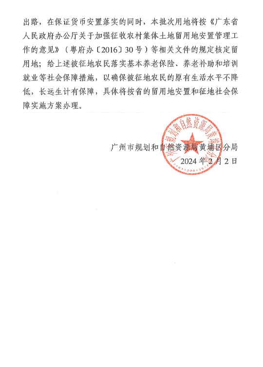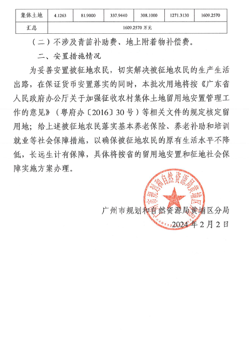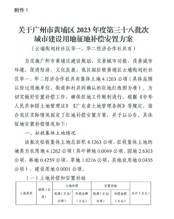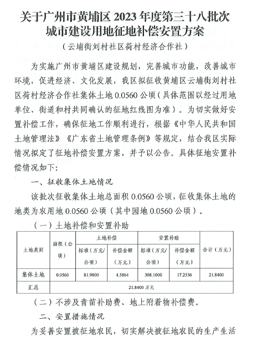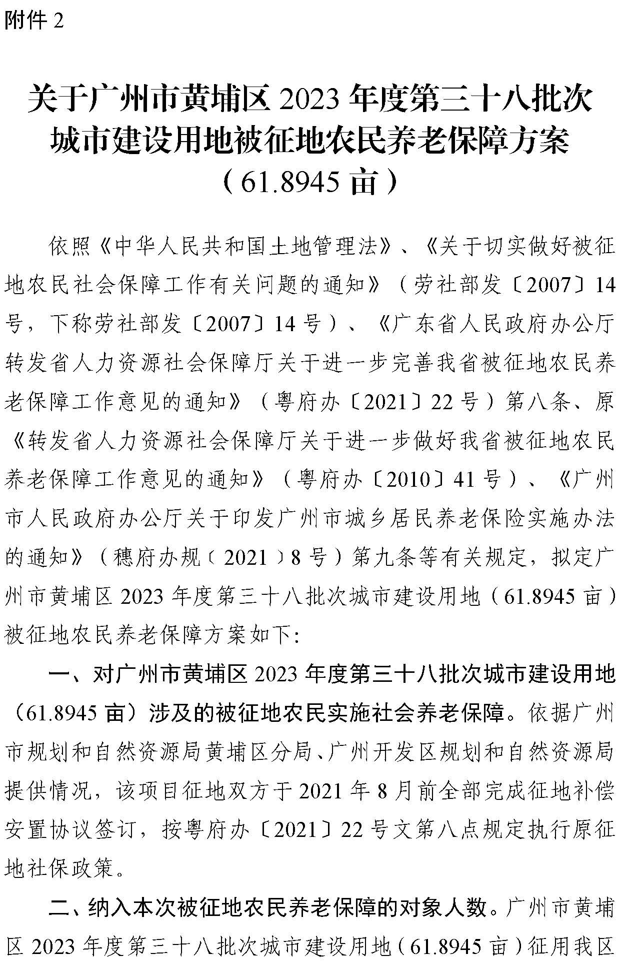 根據《中華人民共和國土地管理法》第二條、第四十五條、第四十七條、第四十八條有關規定精神,我區政府組織規劃和自然資源、財政、農業農村、人力資源和社會保障等部門編製了廣州市黃埔區2023年度第三十八批次城市建設用地征地補償安置方案(附件1)和被征地農民養老保障方案(附件2),現將征收土地補償標準、安置方式和社會保障等有關內容和事項公告如下: