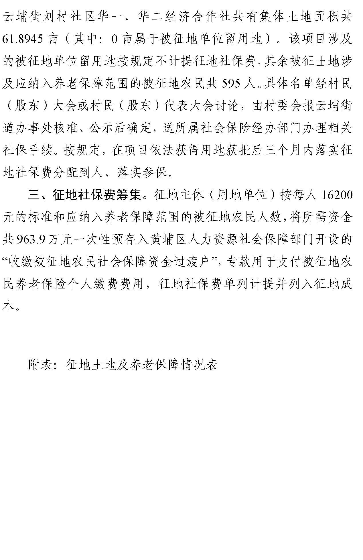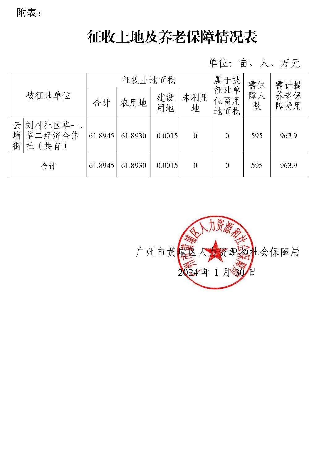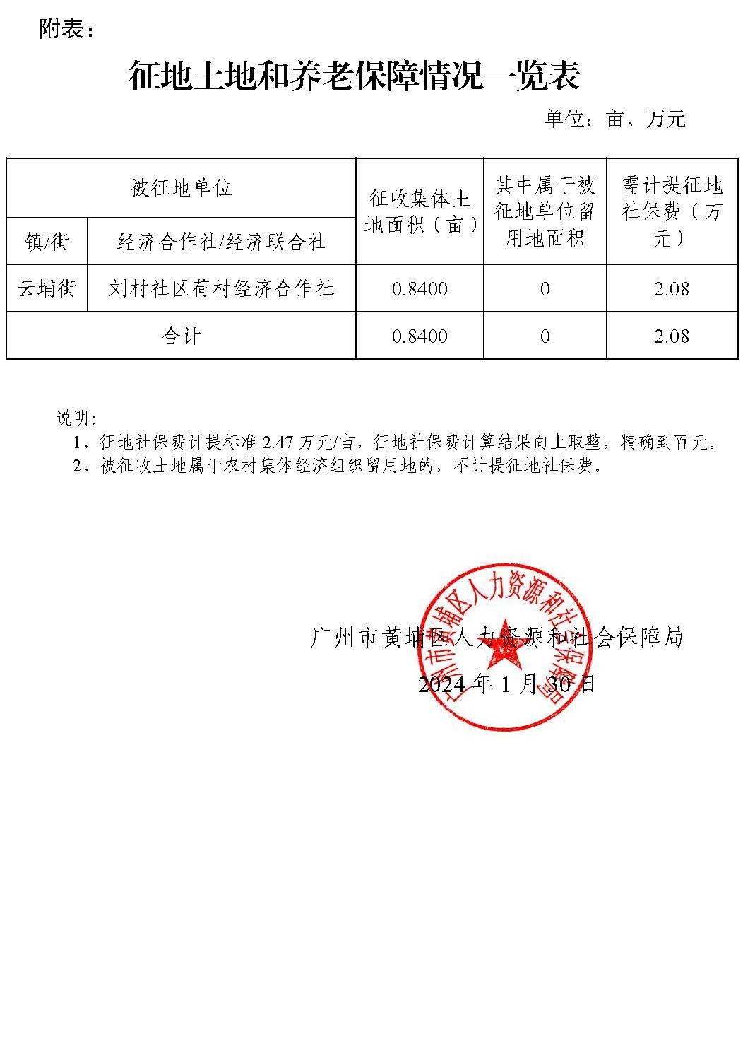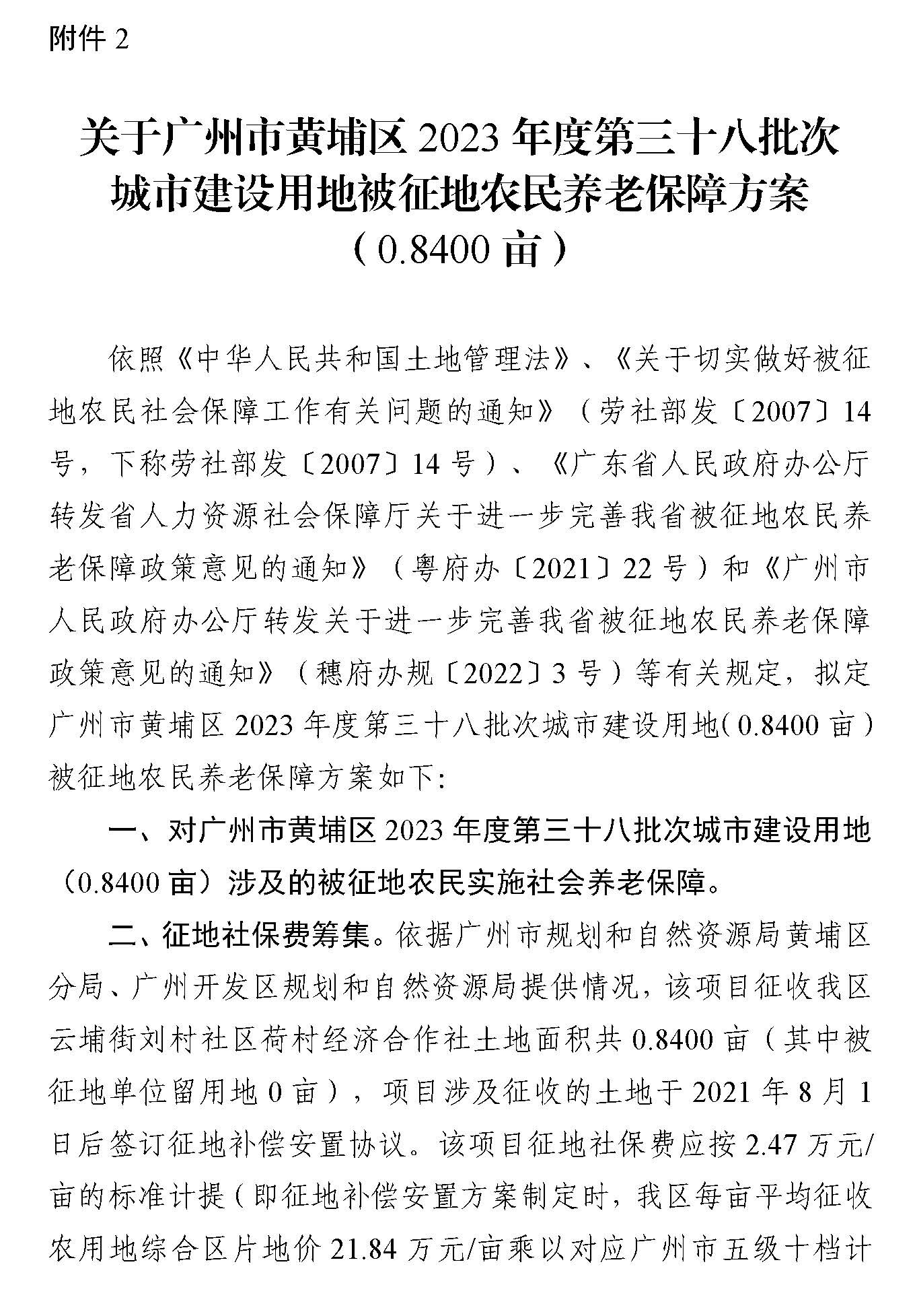(三)社會保障費用。該批次4.1263公頃用地在粵府辦〔2021〕22號文實施前已簽訂征地補償安置協議,按粵府辦〔2010〕41號、穗府辦規〔2021〕8號規定,核定征地項目涉及應納入養老保障範圍的被征地農民人數為595人,按每人16200元標準一次性計提被征地農民養老保障資金共963.9萬元;該批次0.0560公頃用地在粵府辦〔2021〕22號文實施後簽訂征地補償安置協議,該征地社保費按2.47萬元/畝的標準計提,需計提資金共2.08萬元按“籌集資金分配到戶、戶內平均分配到人”的基本原則確定征地社保補貼對象。詳見附件2。