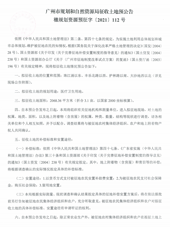 根據《中華人民共和國土地管理法》《中華人民共和國土地管理法實施條例》《廣東省土地管理條例》有關規定,因公共利益需要,需征收廣州市黃埔區大沙街橫沙村屬下的集體土地,該範圍前期已發布征地預公告(穗規劃資源預征字〔2021〕112號)。結合實際征收進展情況,本次對征收土地情況再次預公告,具體情況如下: