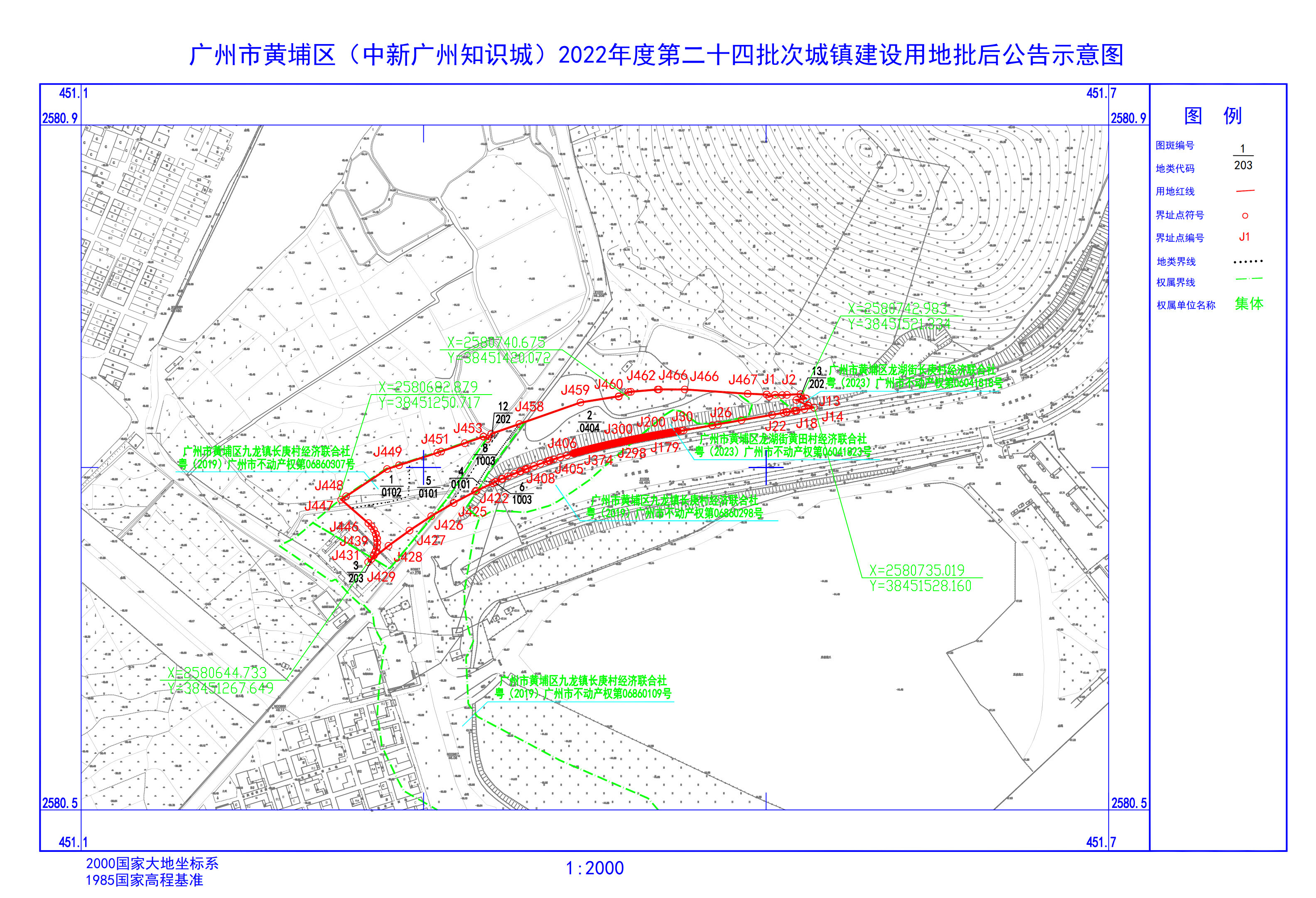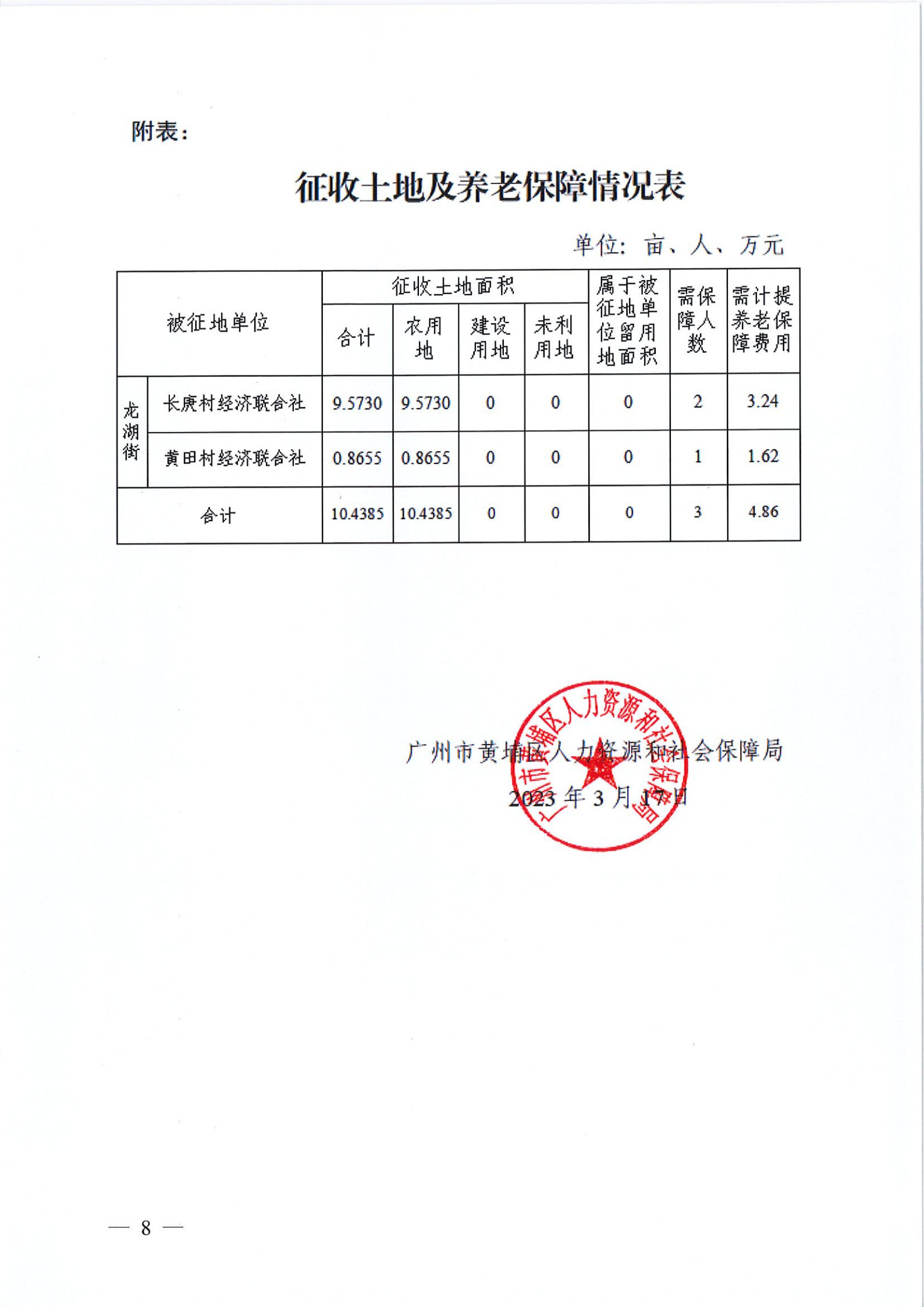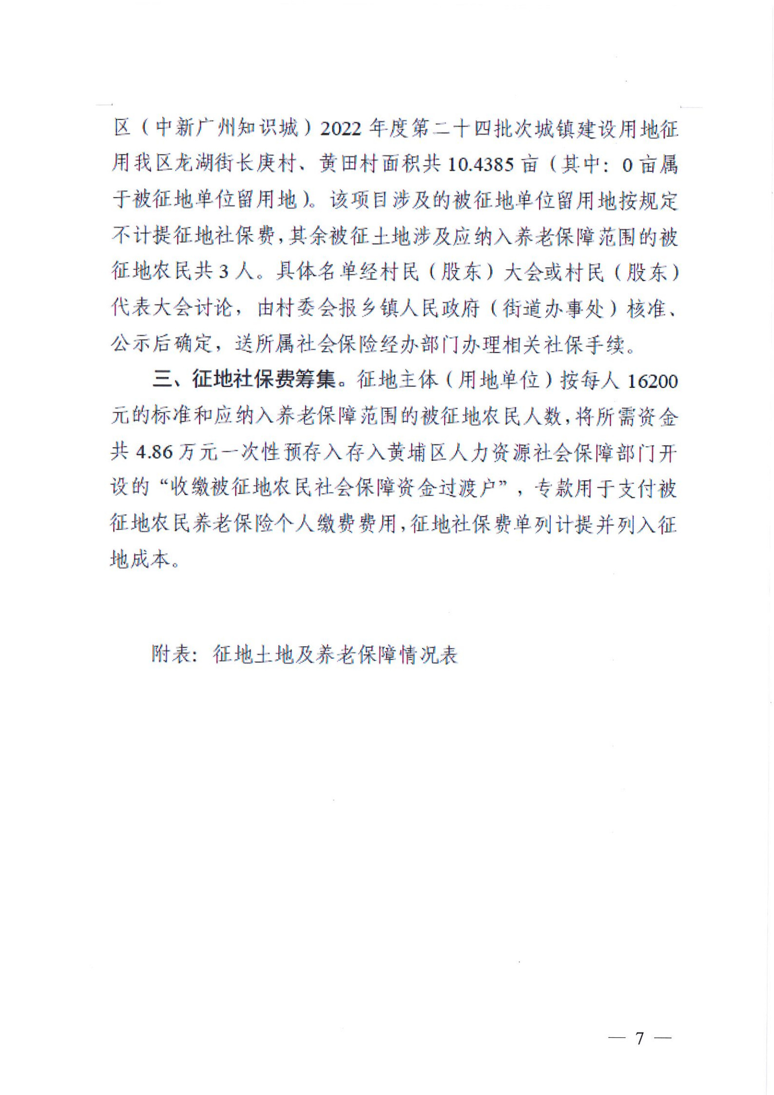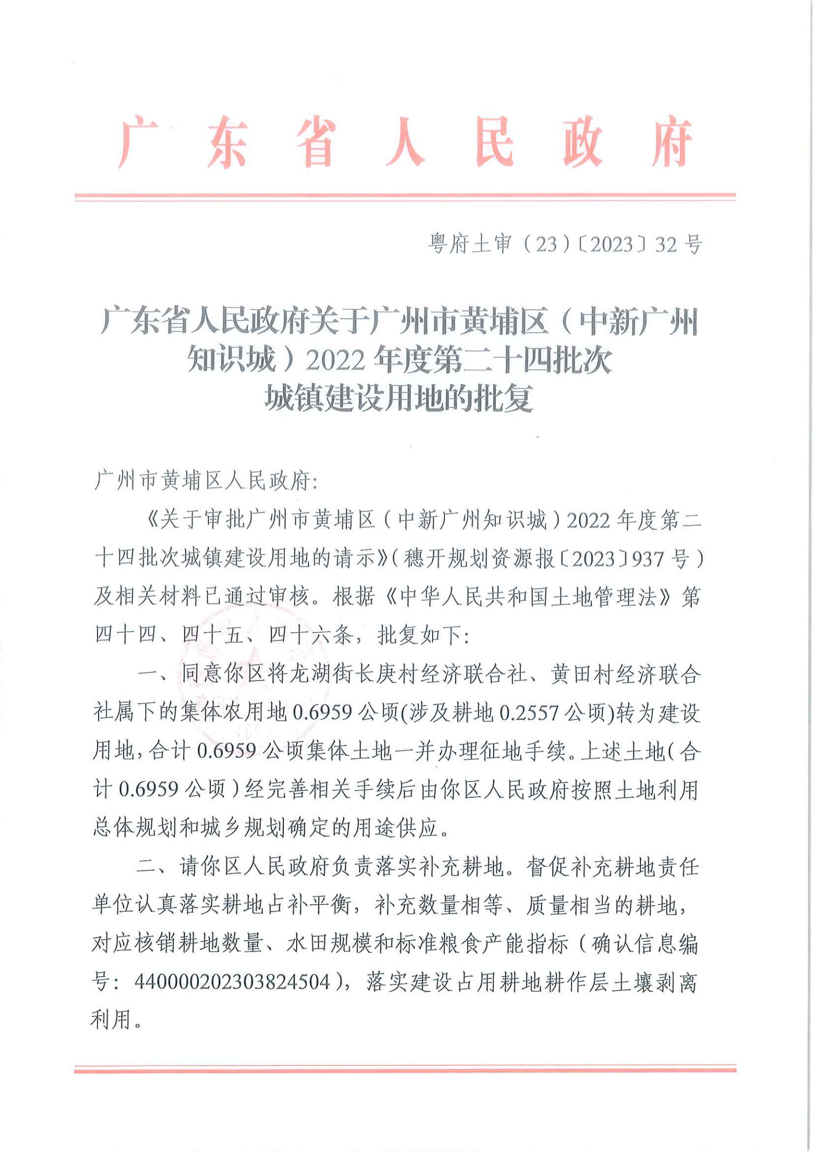 經廣東省人民政府批準(《廣東省人民政府關於廣州市黃埔區(中新廣州知識城)2022年度第二十四批次城鎮建設用地的批複》,粵府土審〔23〕〔2023〕32號),將廣州市黃埔區龍湖街道長庚村經濟聯合社、黃田村經濟聯合社屬下的集體土地0.6959公頃征收為國有土地。現將有關事項公告如下: