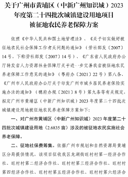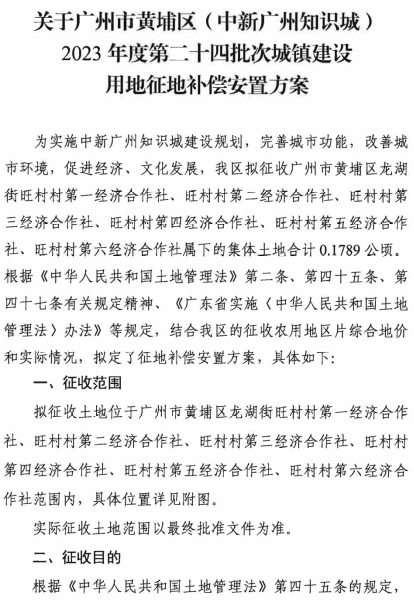 根據《中華人民共和國土地管理法》《中華人民共和國土地管理法實施條例》《廣東省土地管理條例》有關規定,我區政府組織編製了廣州市黃埔區(中新廣州知識城)2023年度第二十四批次城鎮建設用地征收土地補償安置方案(附件1)和被征地農民養老保障方案(附件2),現將征收土地補償安置有關事項公告如下: