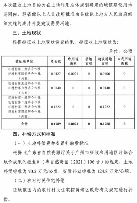 (一)土地補償費和安置補助費標準。根據《廣東省自然資源廳關於廣州市征收農用地區片綜合地價成果的批複》(粵自然資函〔2021〕196號)的規定,土地補償標準為70.2萬元/公頃,安置補助標準為124.8萬元/公頃。