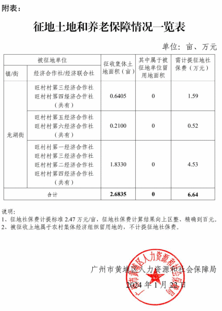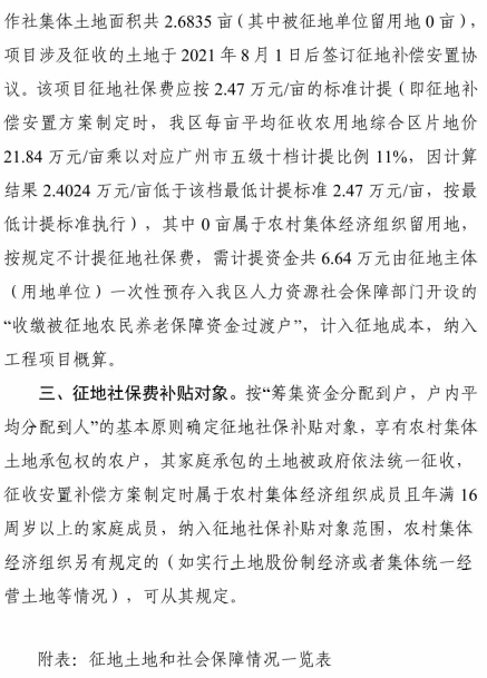 (三)社會保障費用。根據《廣東省人民政府辦公廳轉發省人力資源社會保障廳關於進一步完善我省被征地農民養老保障政策意見的通知》(粵府辦〔2021〕22號)規定,該批次用地在粵府辦〔2021〕22號文實施後簽訂征地補償協議書,該征地社保費按2.47萬元/畝的標準計提,費用合計6.64萬元,按“籌集資金分配到戶、戶內平均分配到人”的基本原則確定征地社保補貼對象。