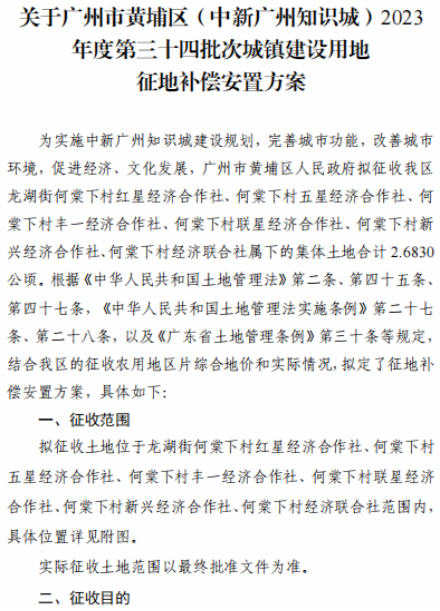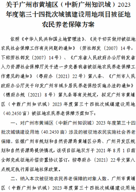 根據《中華人民共和國土地管理法》《中華人民共和國土地管理法實施條例》《廣東省土地管理條例》有關規定,我區政府組織編製了廣州市黃埔區(中新廣州知識城)2023年度第三十四批次城鎮建設用地征收土地補償安置方案(附件1)和被征地農民養老保障方案(附件2),現將征收土地補償安置有關事項公告如下: