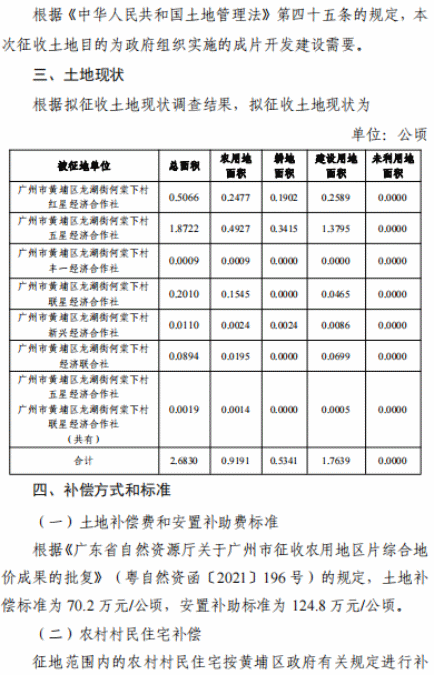 (一)土地補償費和安置補助費標準。根據《廣東省自然資源廳關於廣州市征收農用地區片綜合地價成果的批複》(粵自然資函〔2021〕196號)的規定,土地補償標準為70.2萬元/公頃,安置補助標準為124.8萬元/公頃。