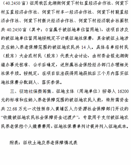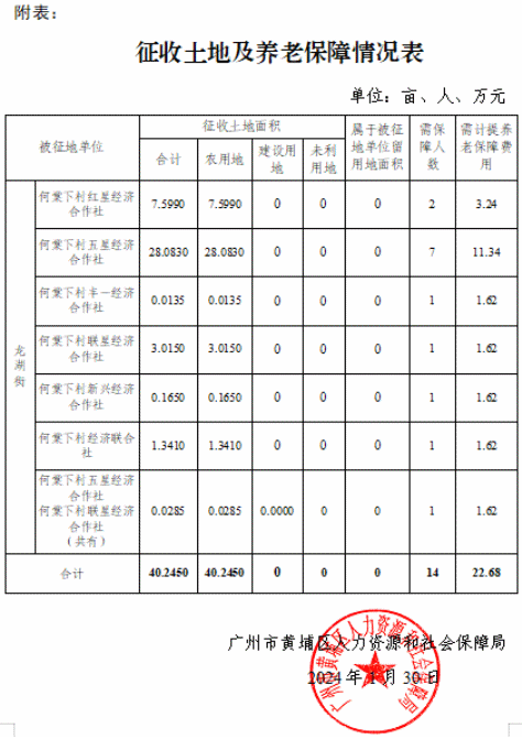 (三)社會保障費用。本批次征收用地中涉及2.6830公頃用地於2021年8月1日前全部完成征地補償安置協議簽訂,根據《廣東省人民政府辦公廳轉發省人力資源社會保障廳關於進一步完善我省被征地農民養老保障政策意見的通知》(粵府辦〔2021〕22號)規定,核定征地項目涉及應納入養老保障範圍的被征地農民人數為14人,按每人16200元標準一次性計提被征地農民養老保障資金共22.68萬元,均存入“收繳被征地農民養老保障資金過渡戶”,專款用於被征地農民繳納養老保險費用。征地批準文件批複的實際範圍有變化的,費用將作相應調整。