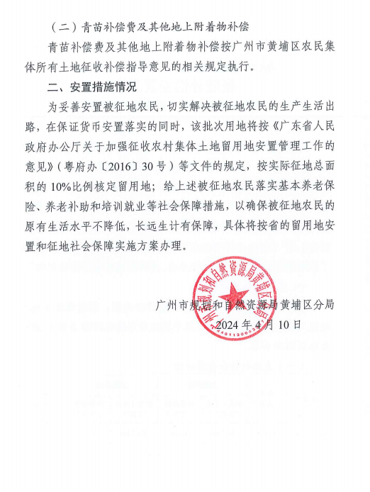(一)土地補償費和安置補助費標準:根據廣州市人民政府《關於公布實施征收農用地區片綜合地價的公告》,征收廣州市黃埔區南崗街集體農用地、建設用地和未利用地29萬元/畝(折合435.0000萬元/公頃)補償(其中土地補償費7.25萬元/畝,安置補助費21.75萬元/畝);詳見附件1。