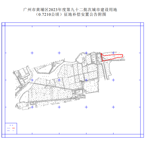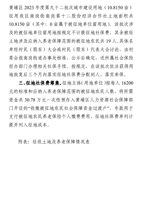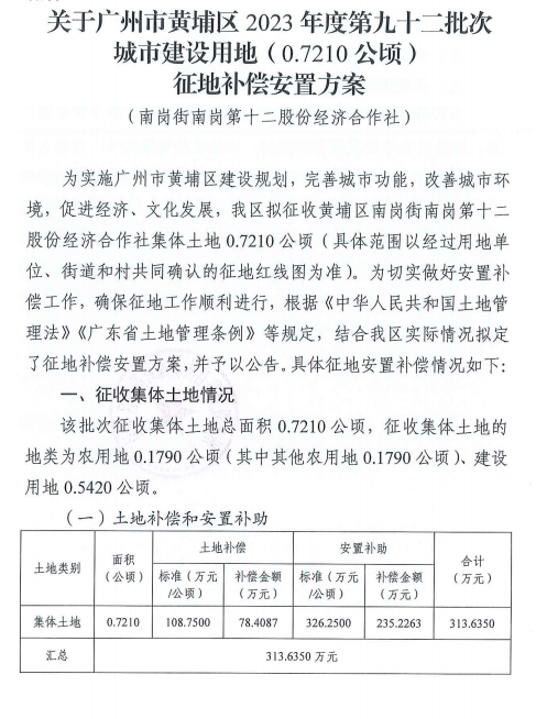根據《中華人民共和國土地管理法》第二條、第四十五條、第四十七條、第四十八條有關規定精神,我區政府組織規劃和自然資源、財政、農業農村、人力資源和社會保障等部門編製了廣州市黃埔區2023年度第九十二批次城市建設用地(0.7210公頃)征地補償安置方案(附件1)和被征地農民養老保障方案(附件2),現將征收土地補償標準、安置方式和社會保障等有關內容和事項公告如下: