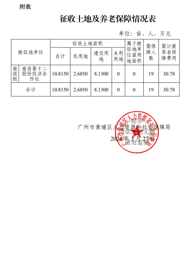 (三)社會保障費用。該批次0.7210公頃用地在粵府辦〔2021〕22號文實施前已簽訂征地補償安置協議,按粵府辦〔2010〕41號、穗府辦規〔2021〕8號規定,核定征地項目涉及應納入養老保障範圍的被征地農民人數為19人,按每人16200元標準一次性計提被征地農民養老保障資金共30.78萬元。詳見附件2。