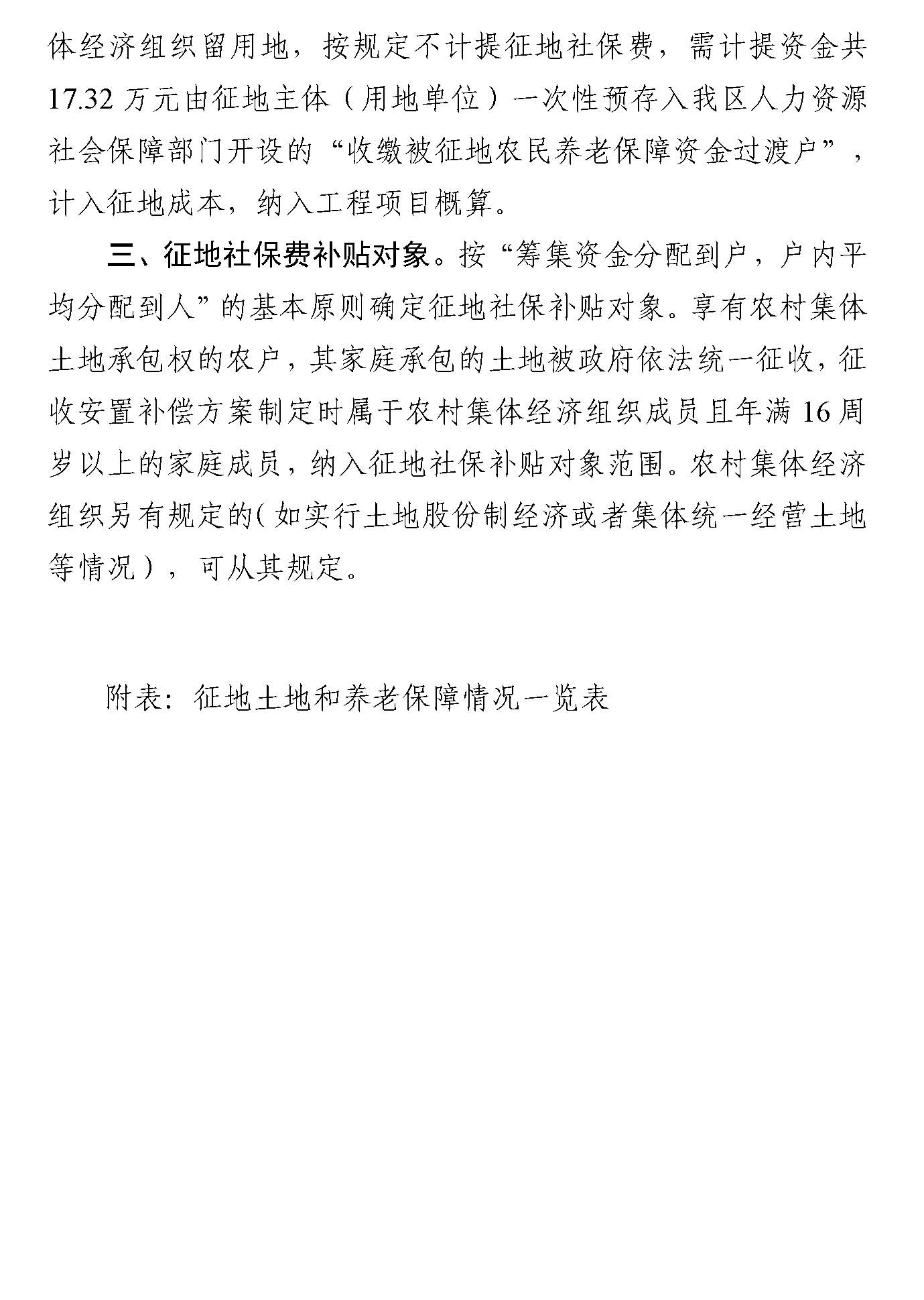 (三)社會保障費用。該批次0.4674公頃用地在粵府辦〔2021〕22號文實施後簽訂征地補償安置協議,該征地社保費按2.47萬元/畝的標準計提,需計提資金共17.32萬元按“籌集資金分配到戶、戶內平均分配到人”的基本原則確定征地社保補貼對象。詳見附件2。