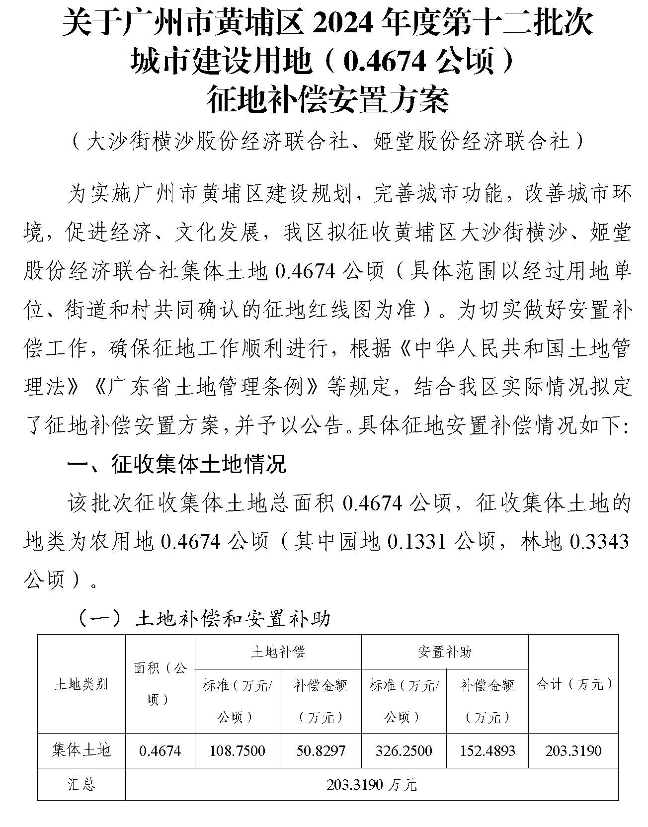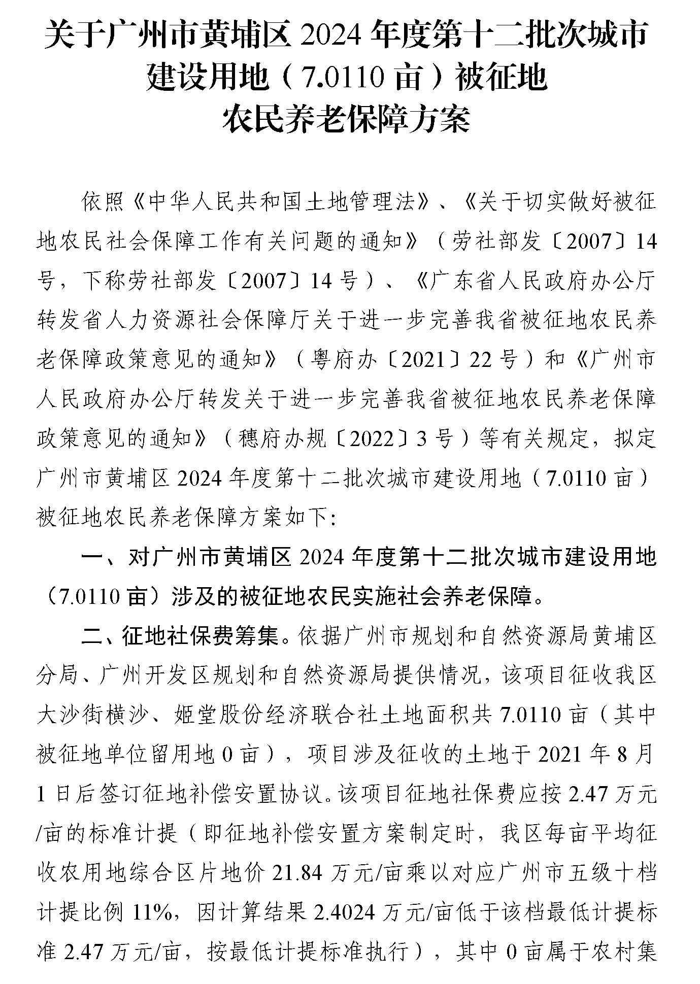 根據《中華人民共和國土地管理法》第二條、第四十五條、第四十七條、第四十八條有關規定精神,我區政府組織規劃和自然資源、財政、農業農村、人力資源和社會保障等部門編製了廣州市黃埔區2024年度第十二批次城市建設用地(0.4674公頃)征地補償安置方案(附件1)和被征地農民養老保障方案(附件2),現將征收土地補償標準、安置方式和社會保障等有關內容和事項公告如下: