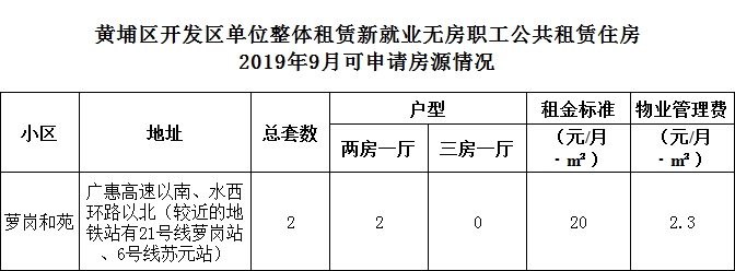 黃埔區開發區單位整體租賃新就業無房職工公共租賃住房2019年9月可申請房源情況