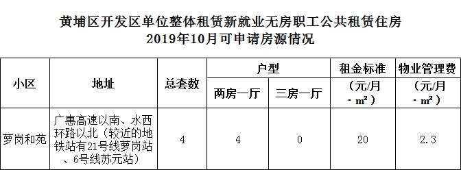 黃埔區開發區單位整體租賃新就業無房職工公共租賃住房2019年10月可申請房源情況