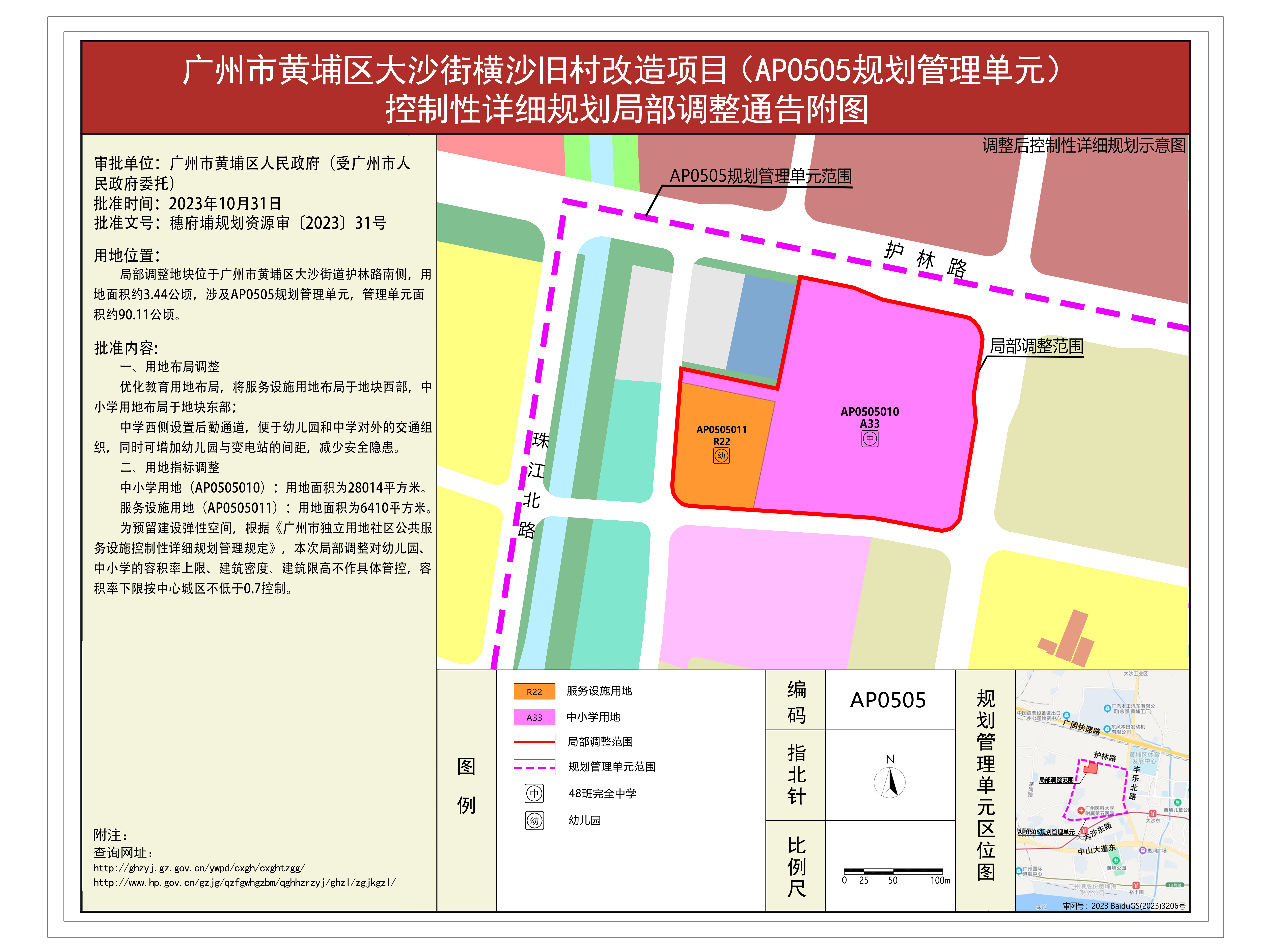 根據《廣東省城市控製性詳細規劃管理條例》要求,《廣州市黃埔區大沙街橫沙舊村改造項目(黃埔區AP0505規劃管理單元)控製性詳細規劃局部調整》已經廣州市人民政府批準(穗府埔規劃資源審〔2023〕31號),自批準之日(2023年10月31日)起生效。