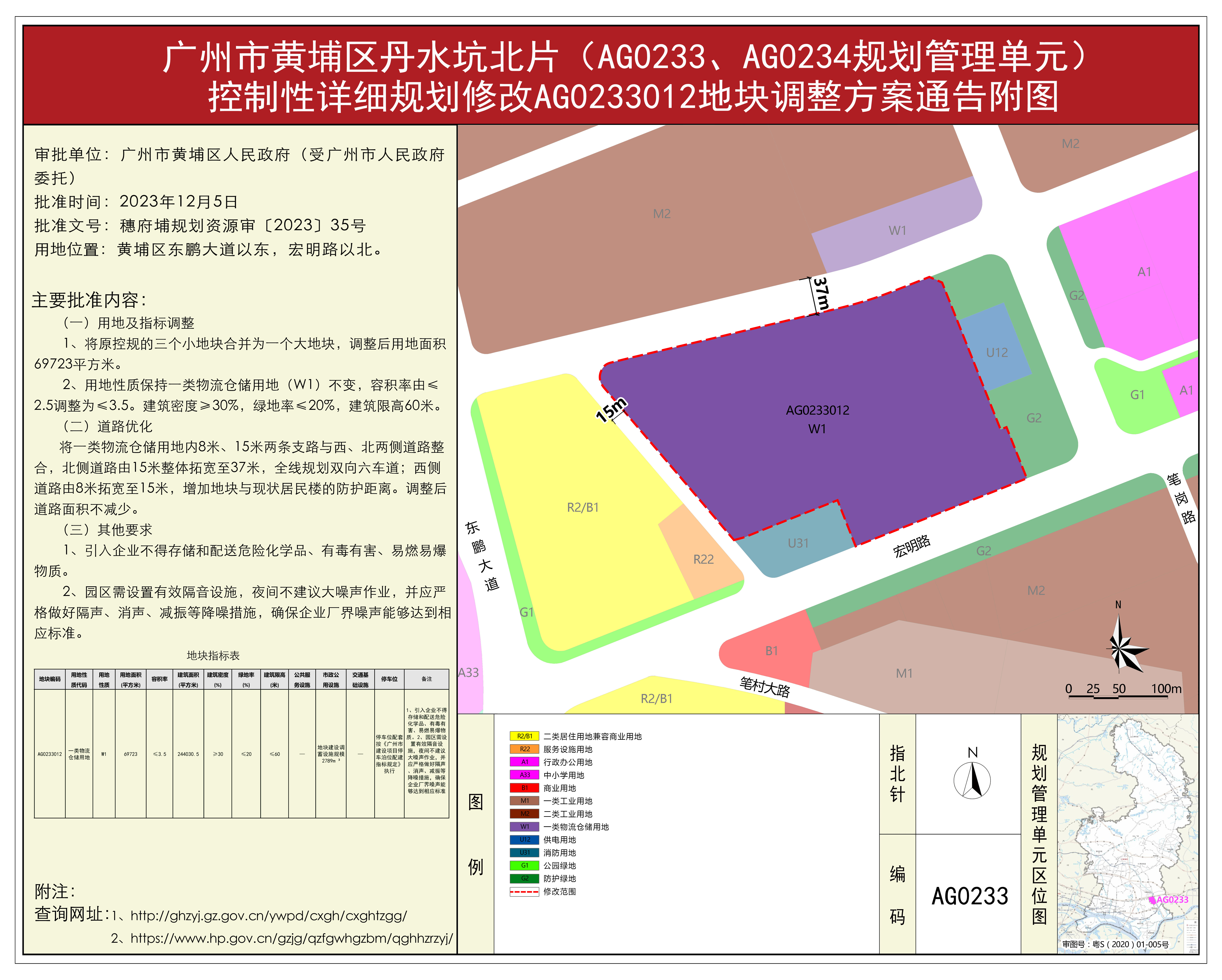 根據《廣東省城市控製性詳細規劃管理條例》要求,《廣州市黃埔區丹水坑北片(AG0233、AG0234規劃管理單元)控製性詳細規劃修改AG0233012地塊調整方案》已完成規劃技術審查、批前公示等程序,並經廣州市黃埔區廣州開發區城鄉規劃委員會審議通過後獲黃埔區人民政府(受市人民政府委托)批準(穗府埔規劃資源審〔2023〕35號),自批準之日(2023年12月5日)起生效。