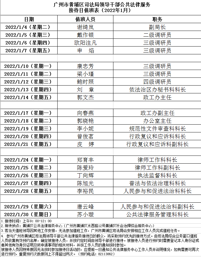 廣州市黃埔區司法局領導幹部公共法律服務接待日值班表(2022年1月)