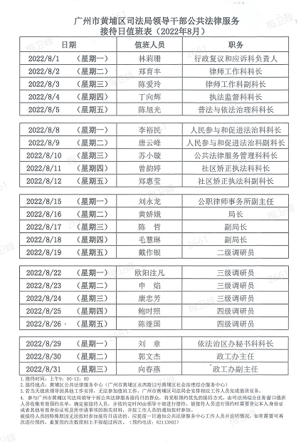 廣州市黃埔區司法局領導幹部公共法律服務接待日值班表(2022年8月)