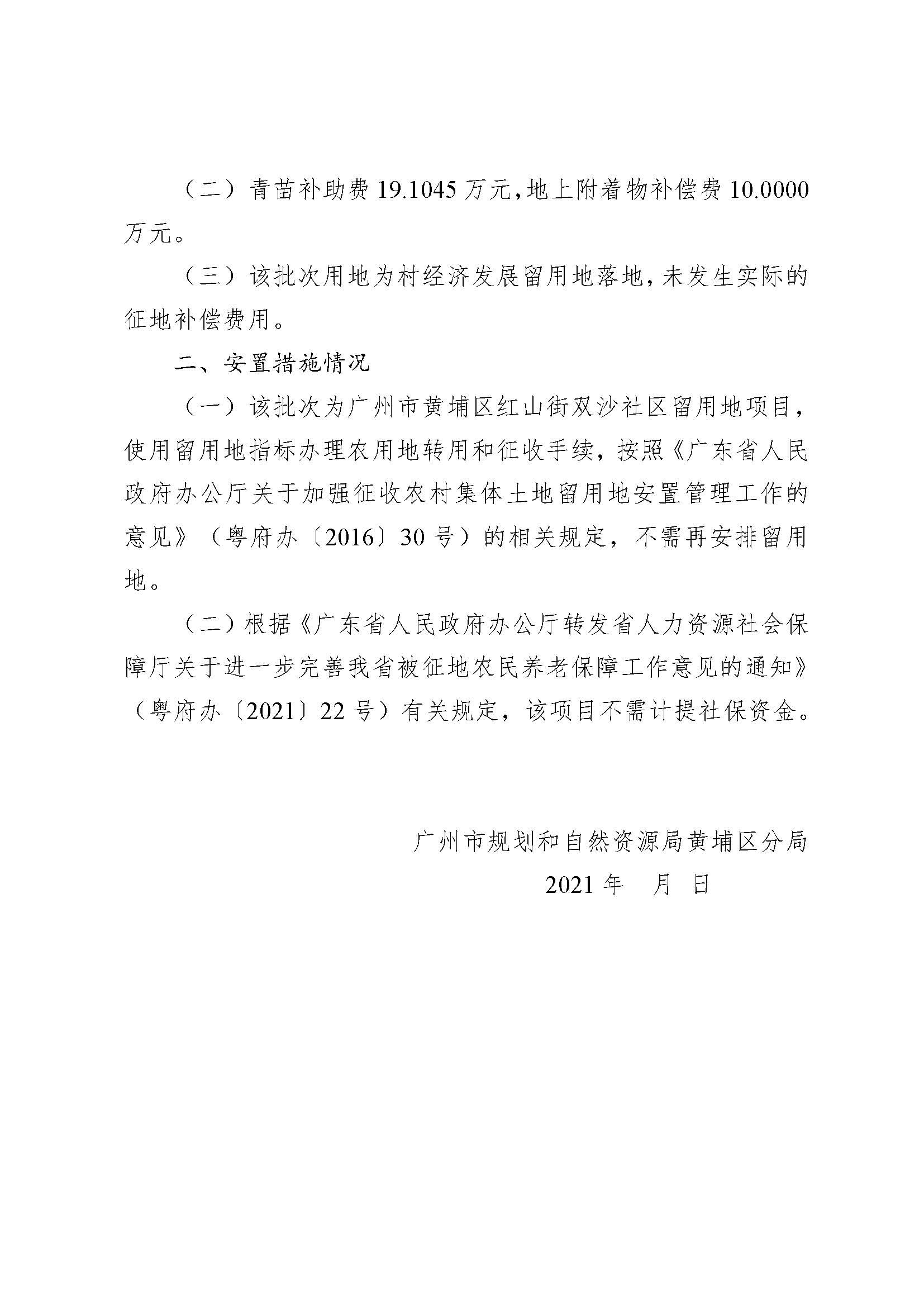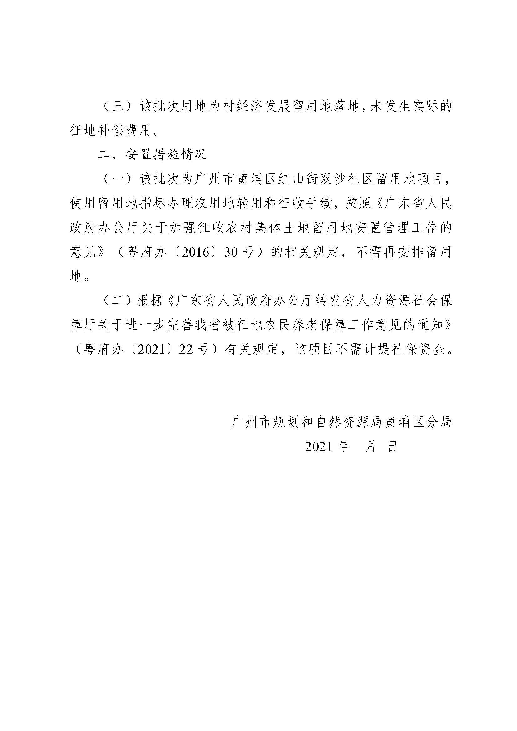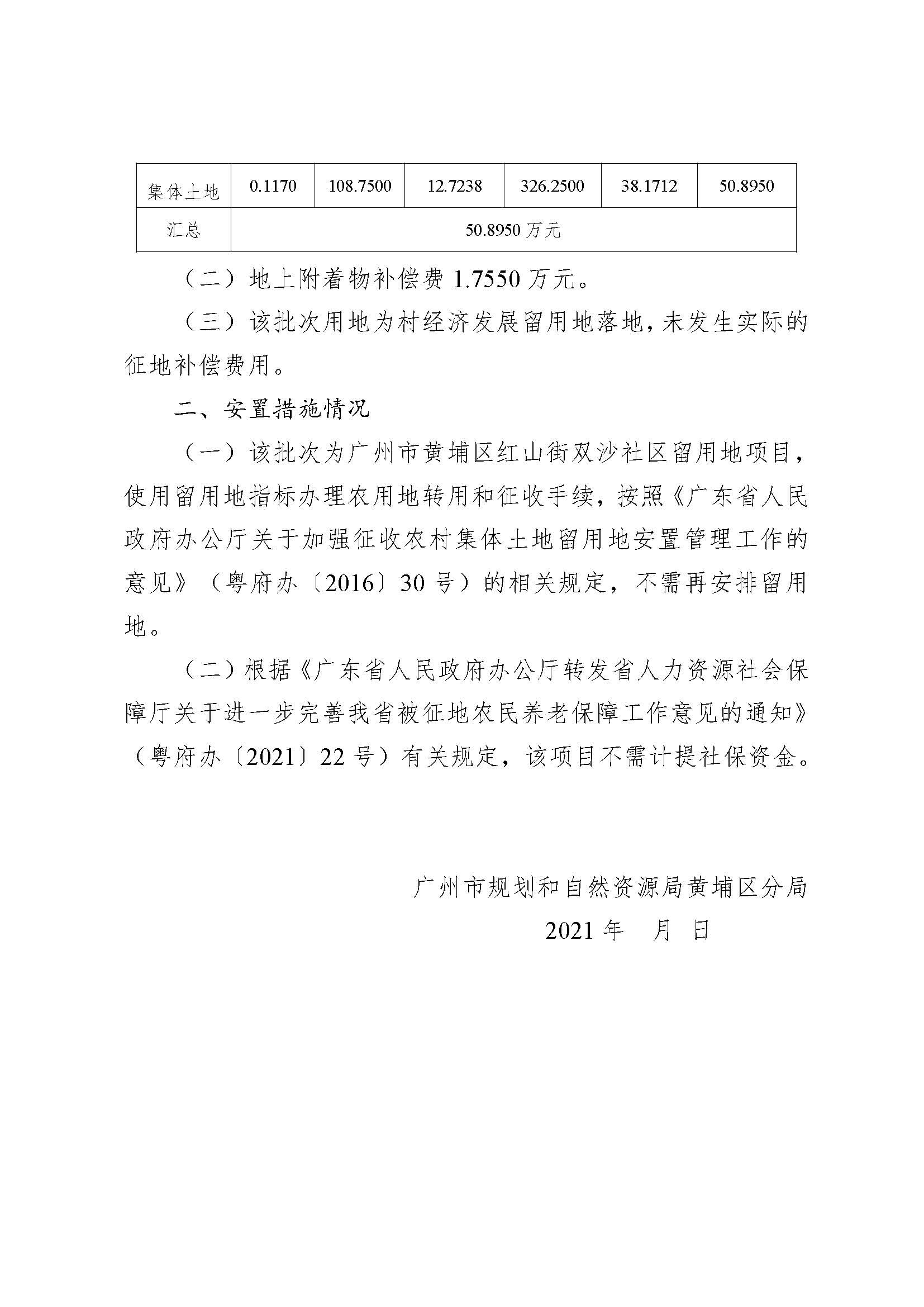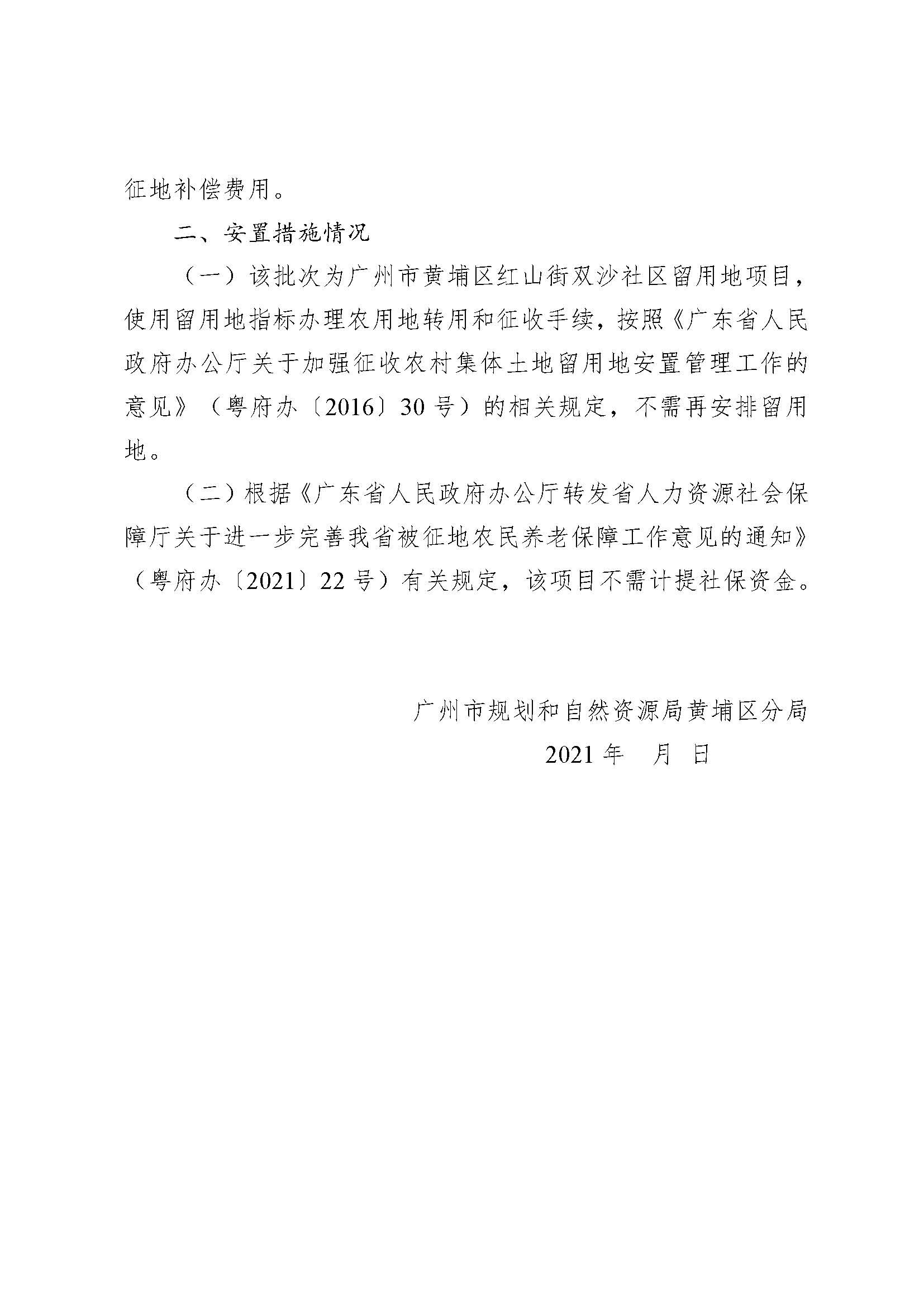 被征地村土地情況:黃埔區紅山街雙沙股份經濟聯合社、雙沙第二股份經濟合作社、雙沙第三股份經濟合作社、雙沙第四股份經濟合作社集體土地合計2.1772公頃,其中農用地2.0711公頃(耕地1.8643公頃、園地0.1197公頃、其他農用地0.0871公頃)、建設用地0.1061公頃。