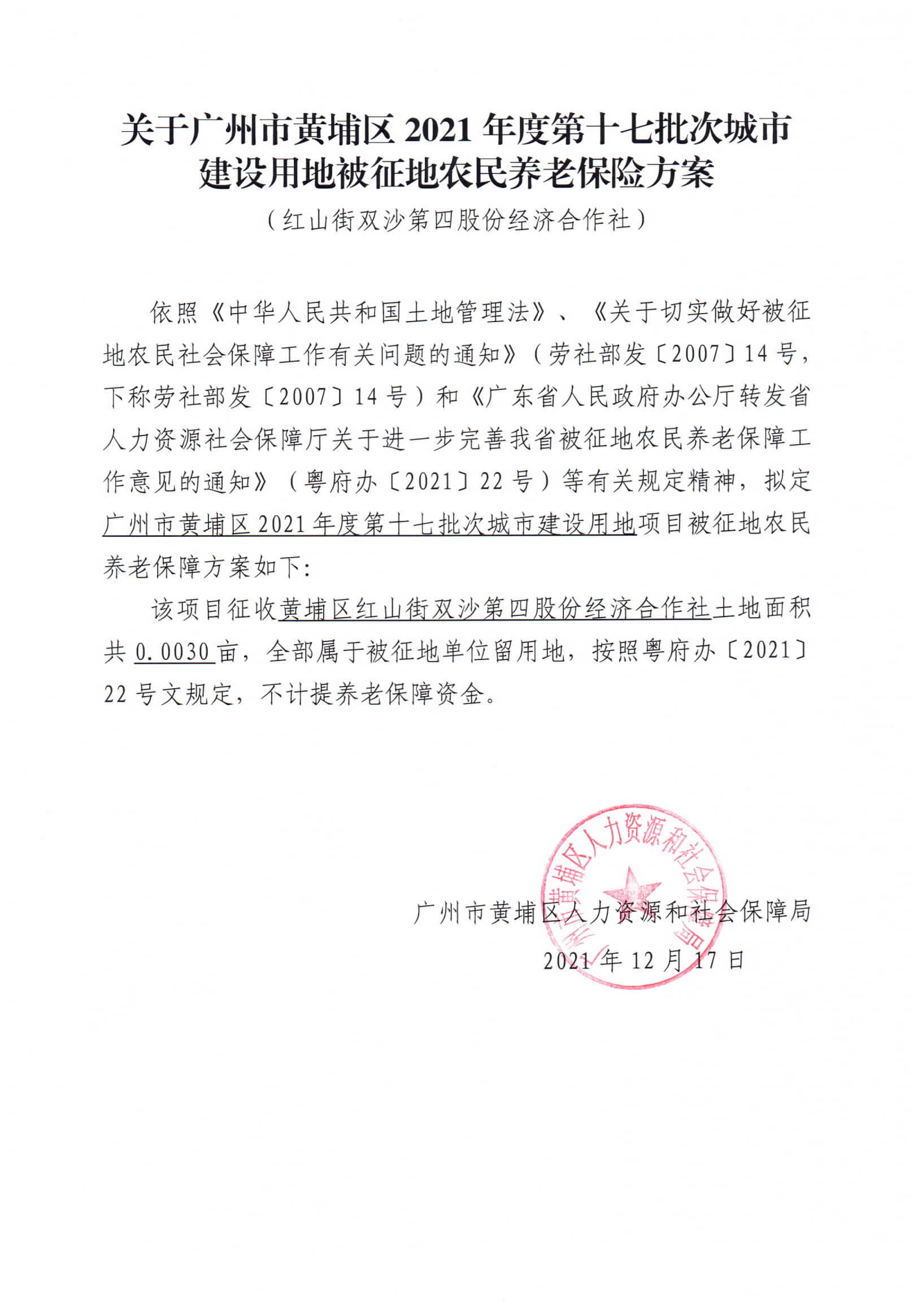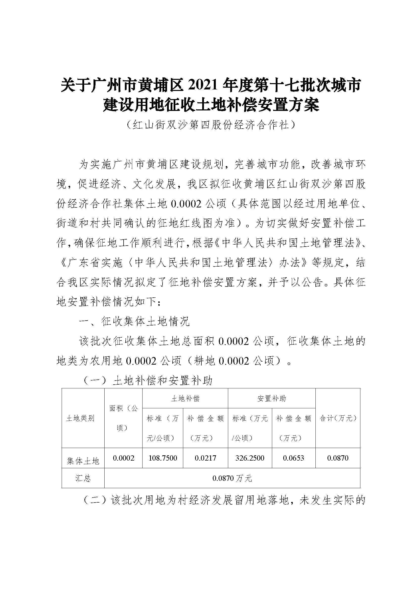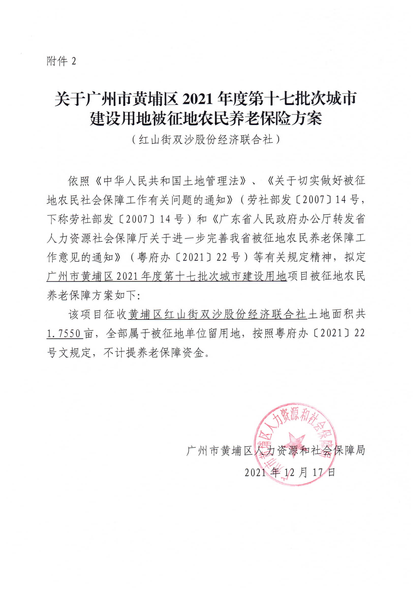 為實施我區城市建設規劃,擬征收廣州市黃埔區紅山街雙沙股份經濟聯合社、雙沙第二股份經濟合作社、雙沙第三股份經濟合作社、雙沙第四股份經濟合作社土地2.1772公頃。為切實做好征地補償安置工作,確保征地工作的順利進行,根據《中華人民共和國土地管理法》(2019修正)《中華人民共和國土地管理法實施條例》等規定,結合我區實際情況,擬定了征地補償安置方案及被征地農民養老保障方案,現就有關事項公告如下: