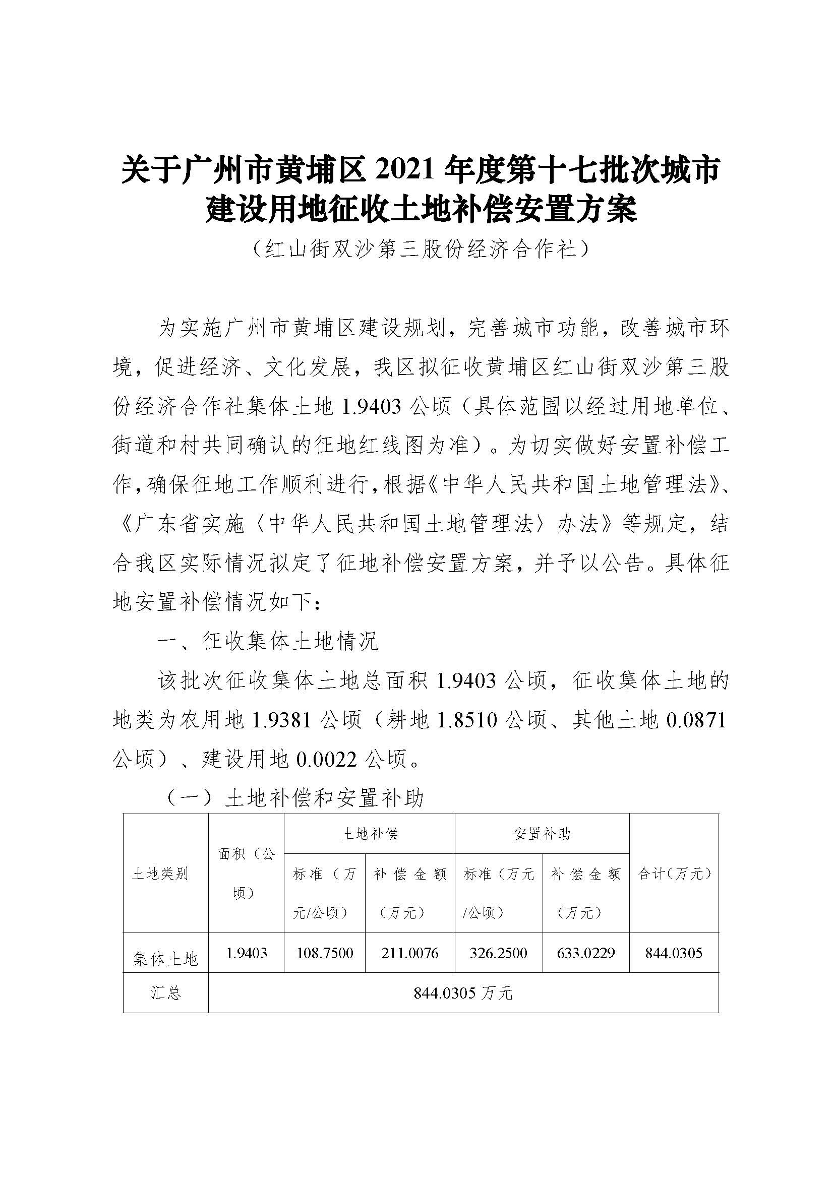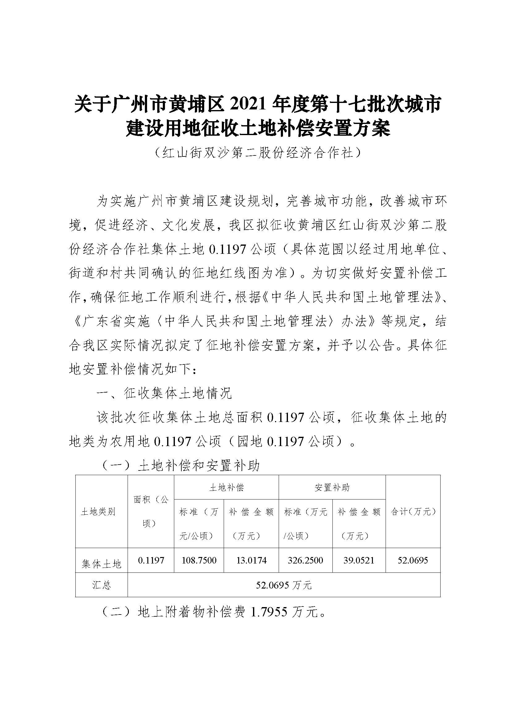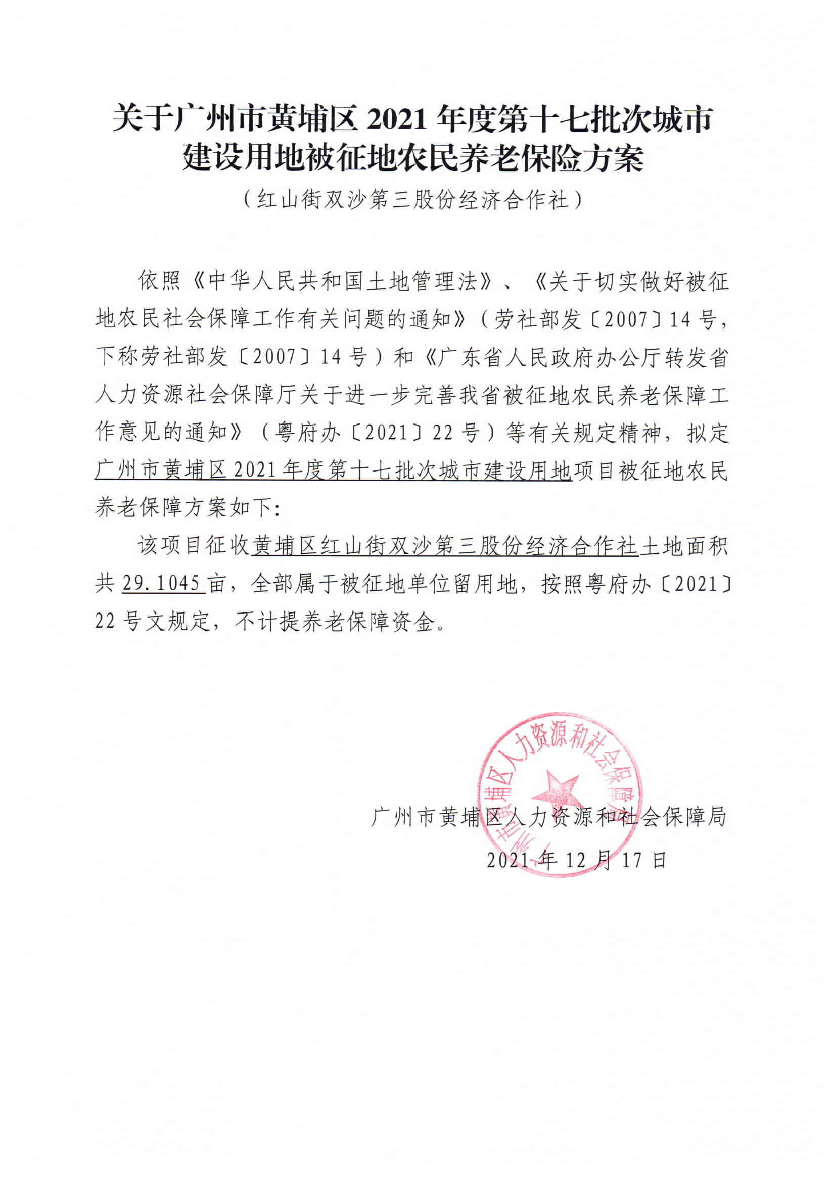 為實施我區城市建設規劃,擬征收廣州市黃埔區紅山街雙沙股份經濟聯合社、雙沙第二股份經濟合作社、雙沙第三股份經濟合作社、雙沙第四股份經濟合作社土地2.1772公頃。為切實做好征地補償安置工作,確保征地工作的順利進行,根據《中華人民共和國土地管理法》(2019修正)《中華人民共和國土地管理法實施條例》等規定,結合我區實際情況,擬定了征地補償安置方案及被征地農民養老保障方案,現就有關事項公告如下: