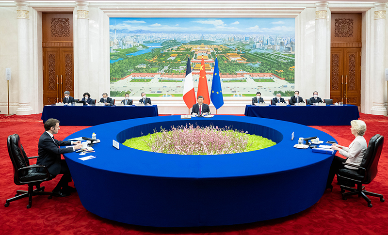 4月6日下午,國家主席習近平在北京人民大會堂同法國總統馬克龍、歐盟委員會主席馮德萊恩舉行中法歐三方會晤。