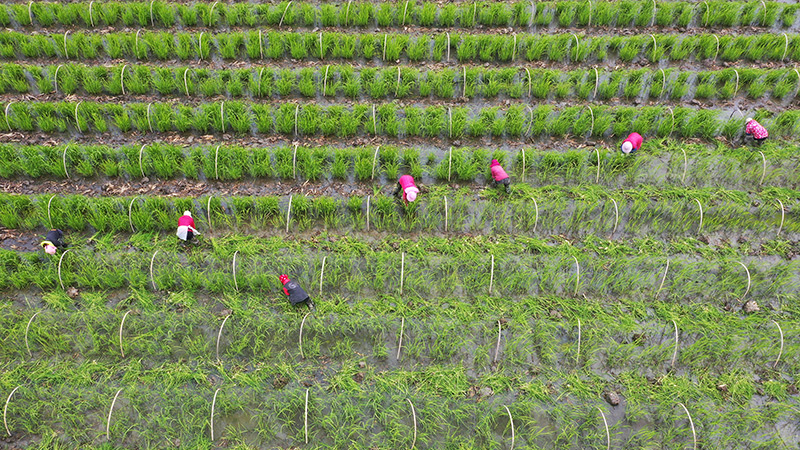 2023年2月23日,浙江省溫嶺市新河鎮農民進行茭白秧苗春季管理(無人機照片)。
