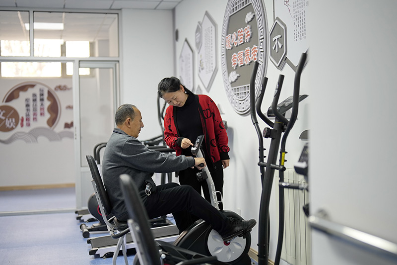 2023年4月16日,老年人在唐山市豐南區胥各莊鎮一處社區養老服務中心內健身。