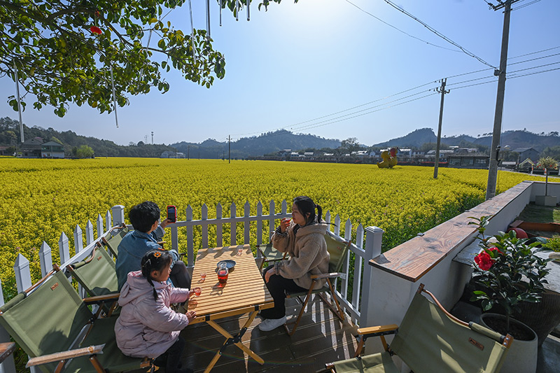 2023年3月28日,在杭州市臨安區太陽鎮太陽米基地旁的一家民宿餐廳,客人在院子裏喝茶賞景。