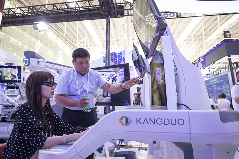 在黑龍江省哈爾濱市舉辦的2022世界5G大會展廳裏,參展商現場演示5G遠程手術機器人(2022年8月10日攝)。