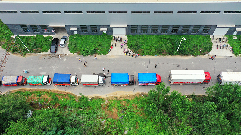 在河北省涿州市鋼研物資儲備點外,運送物資的車輛排起長隊(8月5日攝,無人機照片)。