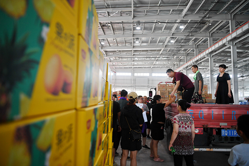 工作人員和誌願者在河北省涿州市鋼研物資儲備點內將捐贈物資裝車外運(8月5日攝)。