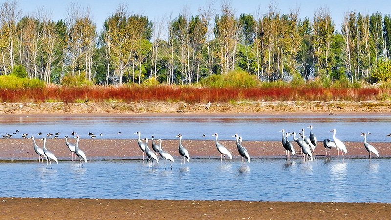 在山東黃河三角洲國家級自然保護區拍攝的白枕鶴(2022年10月18日攝)。新華社發