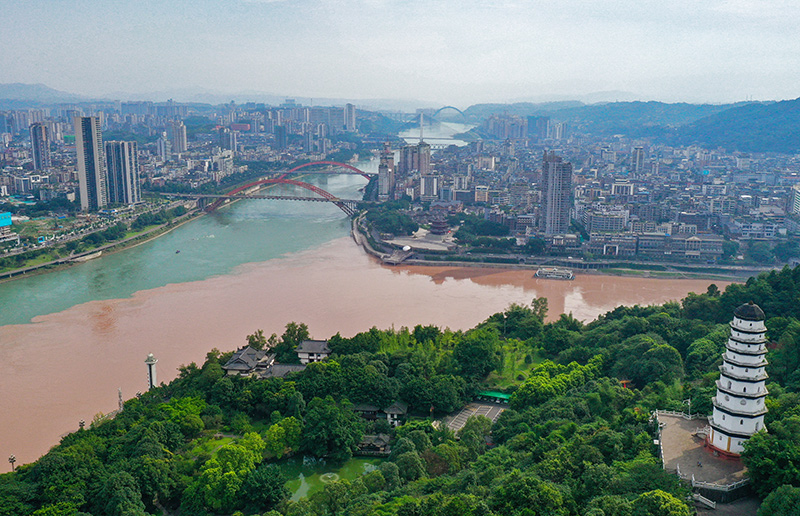 四川宜賓,“萬裏長江第一城”。岷江和金沙江在此交彙,長江始稱“長江”。遠山疊翠,江水滔滔,岸邊“共抓大保護 不搞大開發”幾個大字格外醒目。