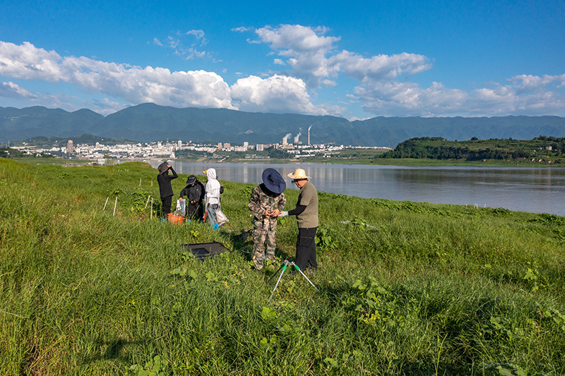 在位於重慶的中國科學院三峽庫區水土保持與環境研究站,中國科學院成都山地所科研人員在庫區消落帶上開展相關監測(2023年7月5日攝,無人機照片)。