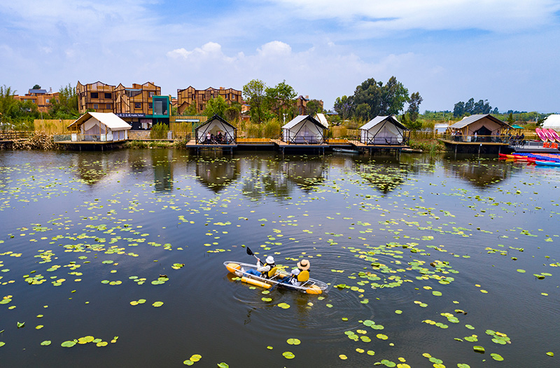 遊人在滇池南岸晉寧區上蒜鎮小漁村劃船休閑(2023年4月30日攝,無人機照片)。